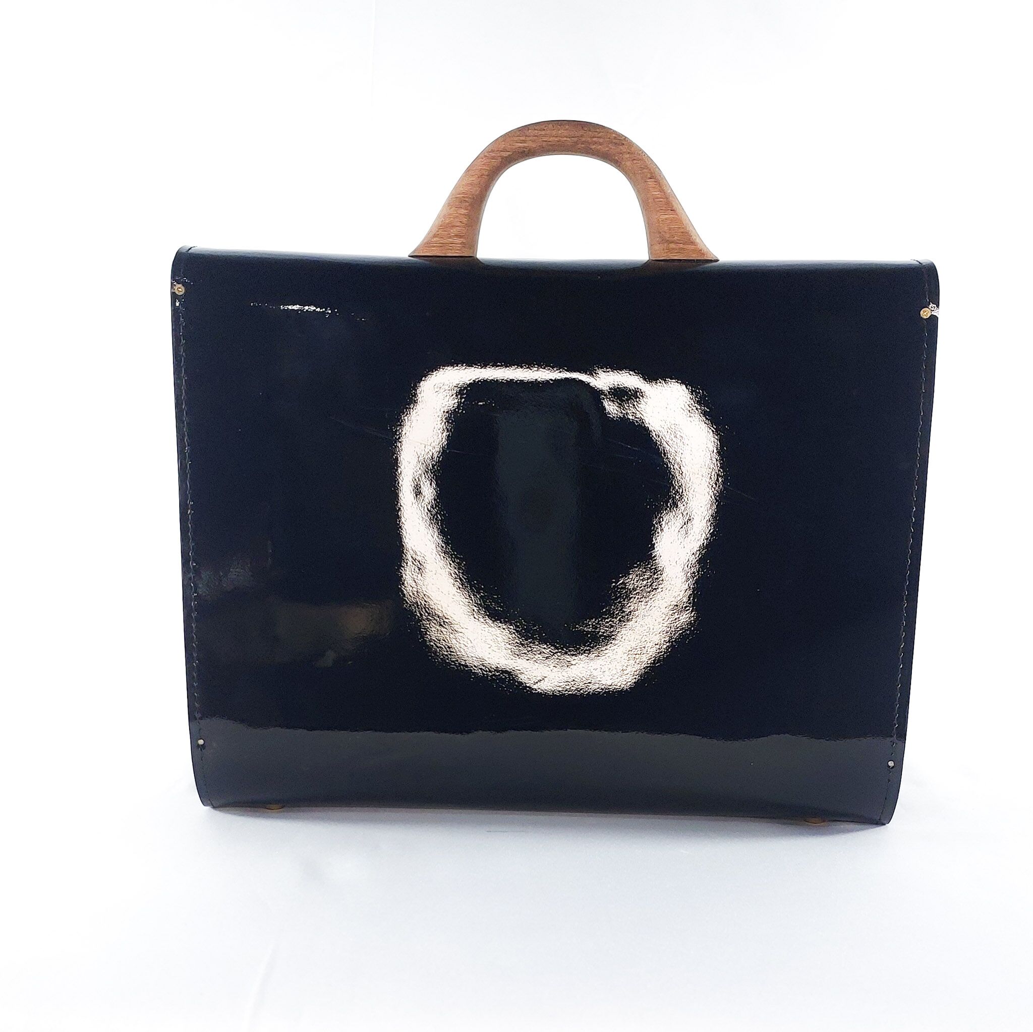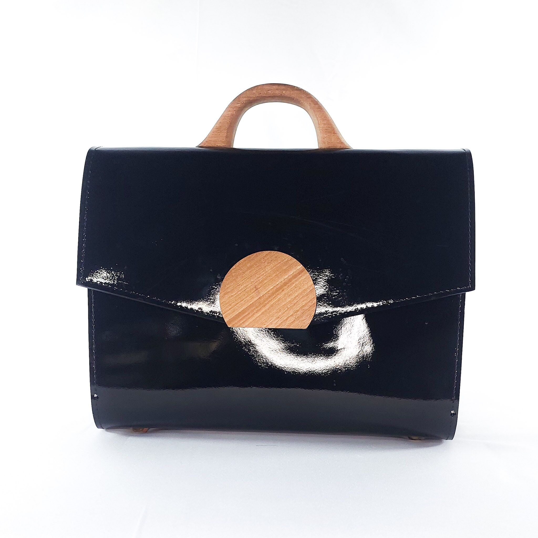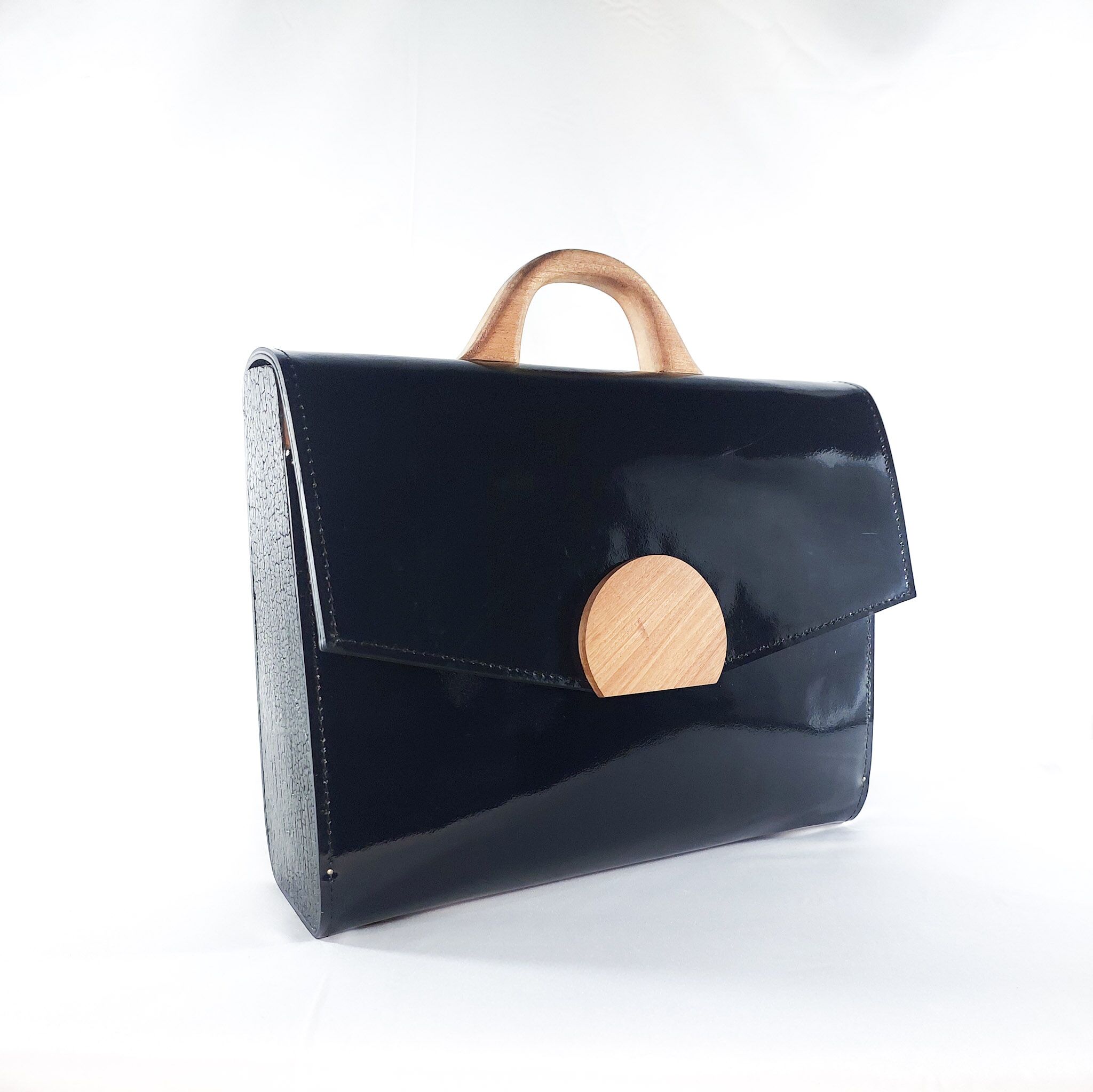 This bag redefines executive elegance. With its crisp structure, clean lines, and commanding silhouette, it?s crafted from textured black leather and anchored by a teardrop-shaped wooden clasp ? subtle but striking. The hand-carved wooden handle adds a natural, grounded warmth to an otherwise sleek and assertive form.
