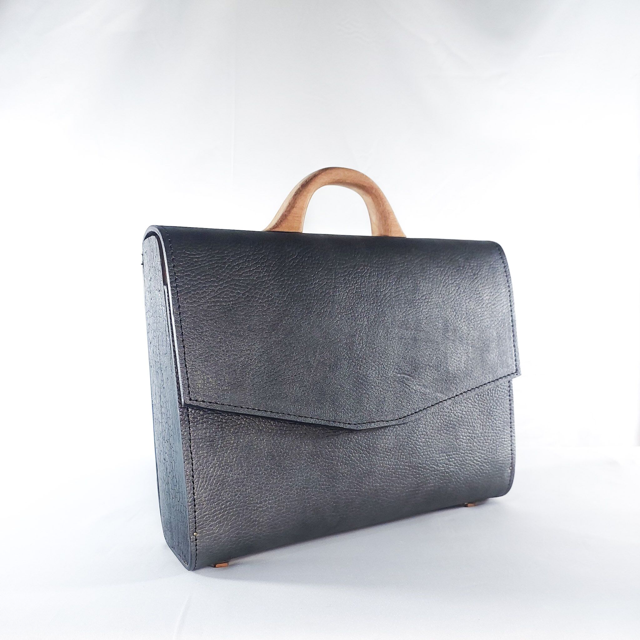 This bag redefines executive elegance. With its crisp structure, clean lines, and commanding silhouette, it?s crafted from textured black leather and anchored by a teardrop-shaped wooden clasp ? subtle but striking. The hand-carved wooden handle adds a natural, grounded warmth to an otherwise sleek and assertive form.