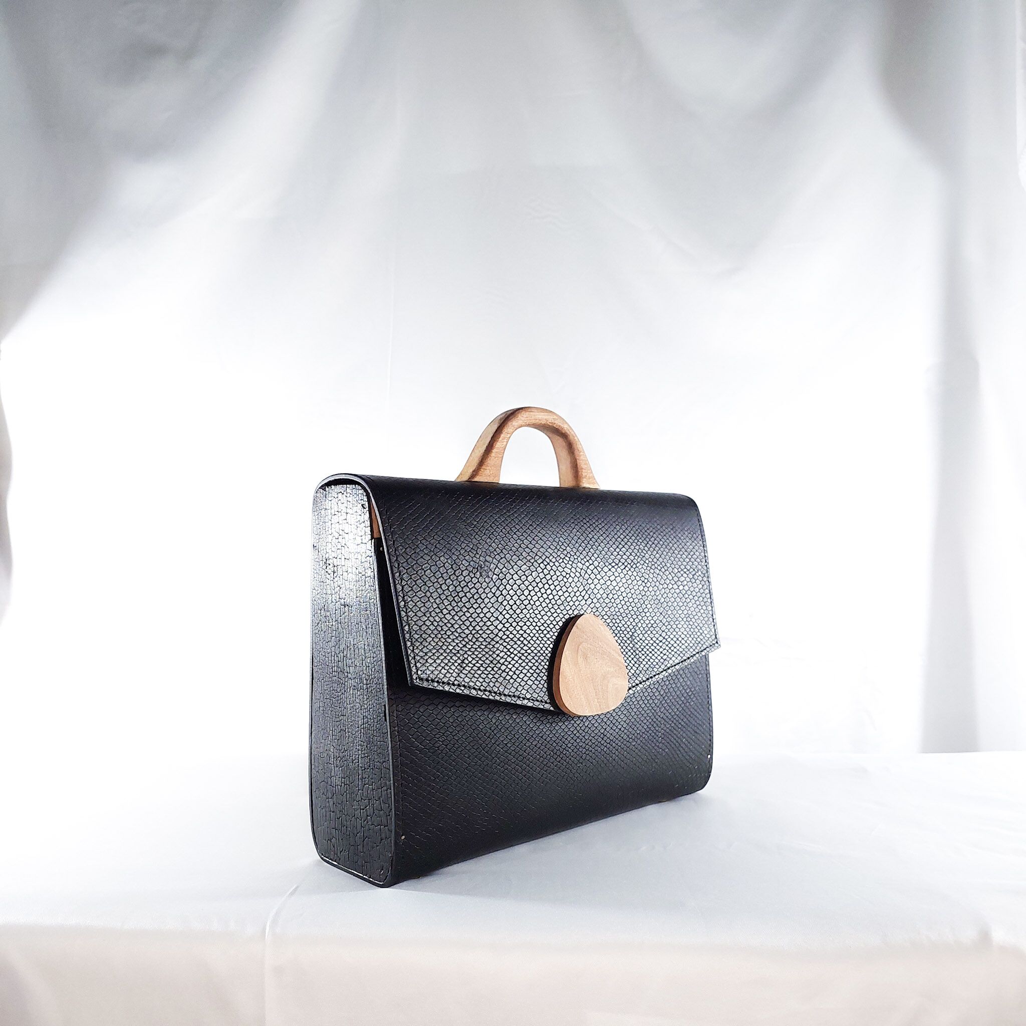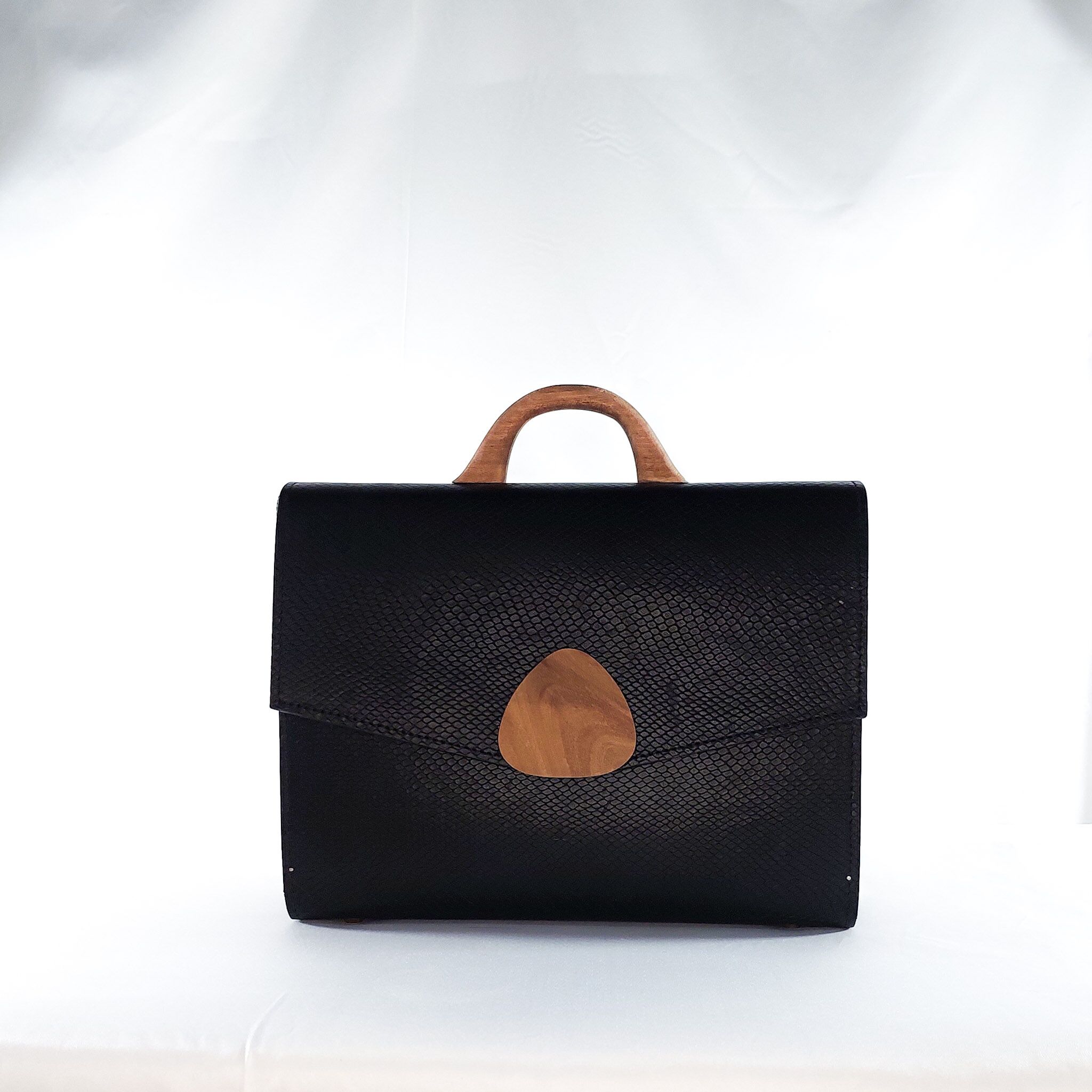 This bag redefines executive elegance. With its crisp structure, clean lines, and commanding silhouette, it?s crafted from textured black leather and anchored by a teardrop-shaped wooden clasp ? subtle but striking. The hand-carved wooden handle adds a natural, grounded warmth to an otherwise sleek and assertive form.