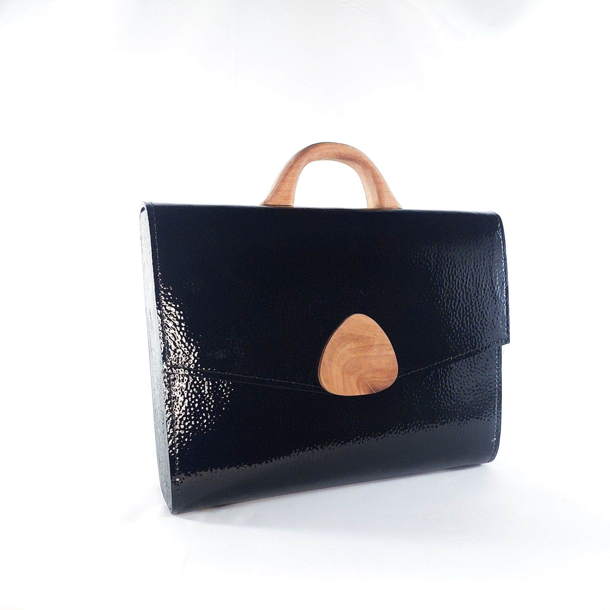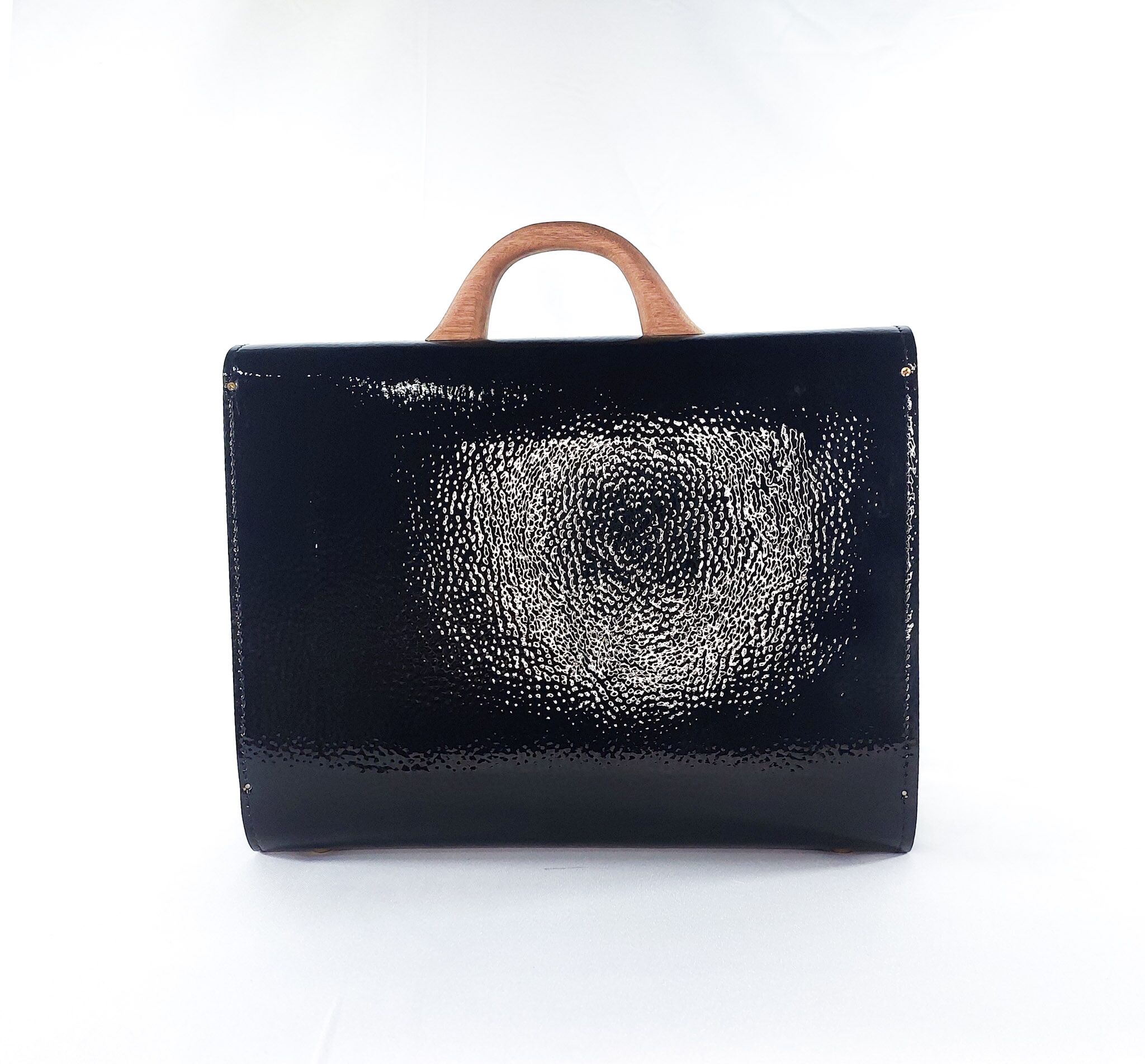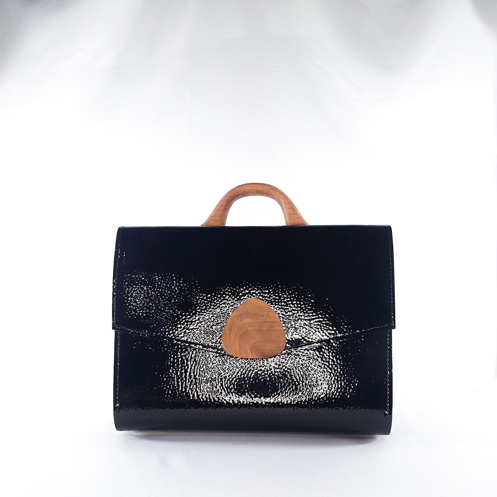 This bag redefines executive elegance. With its crisp structure, clean lines, and commanding silhouette, it?s crafted from textured black leather and anchored by a teardrop-shaped wooden clasp ? subtle but striking. The hand-carved wooden handle adds a natural, grounded warmth to an otherwise sleek and assertive form.