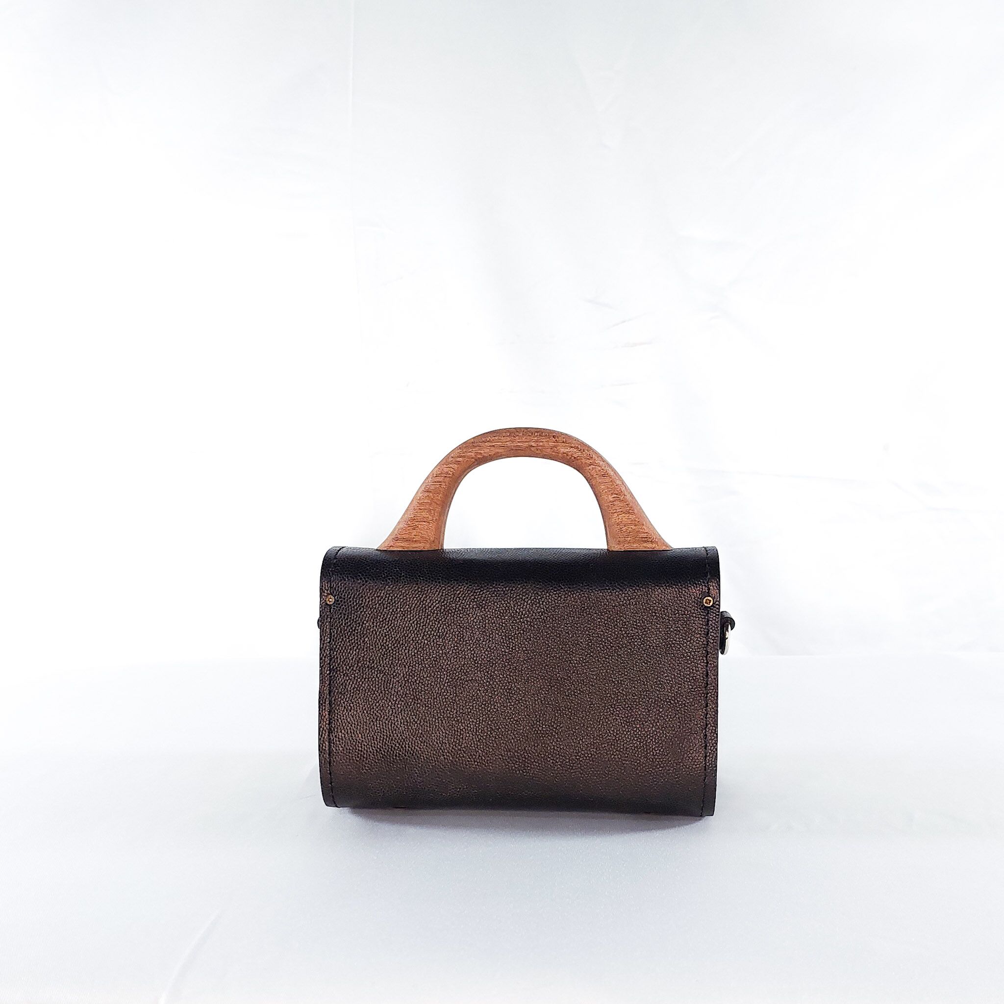 This mini top handle bag from the Coal Soul Collection brings balance to boldness. Designed with clean lines and a compact silhouette, it features a rich black body paired with sculptural wooden accents ? a smooth circular wooden flap accent and a curved, hand-carved handle that feels both grounded and elevated.