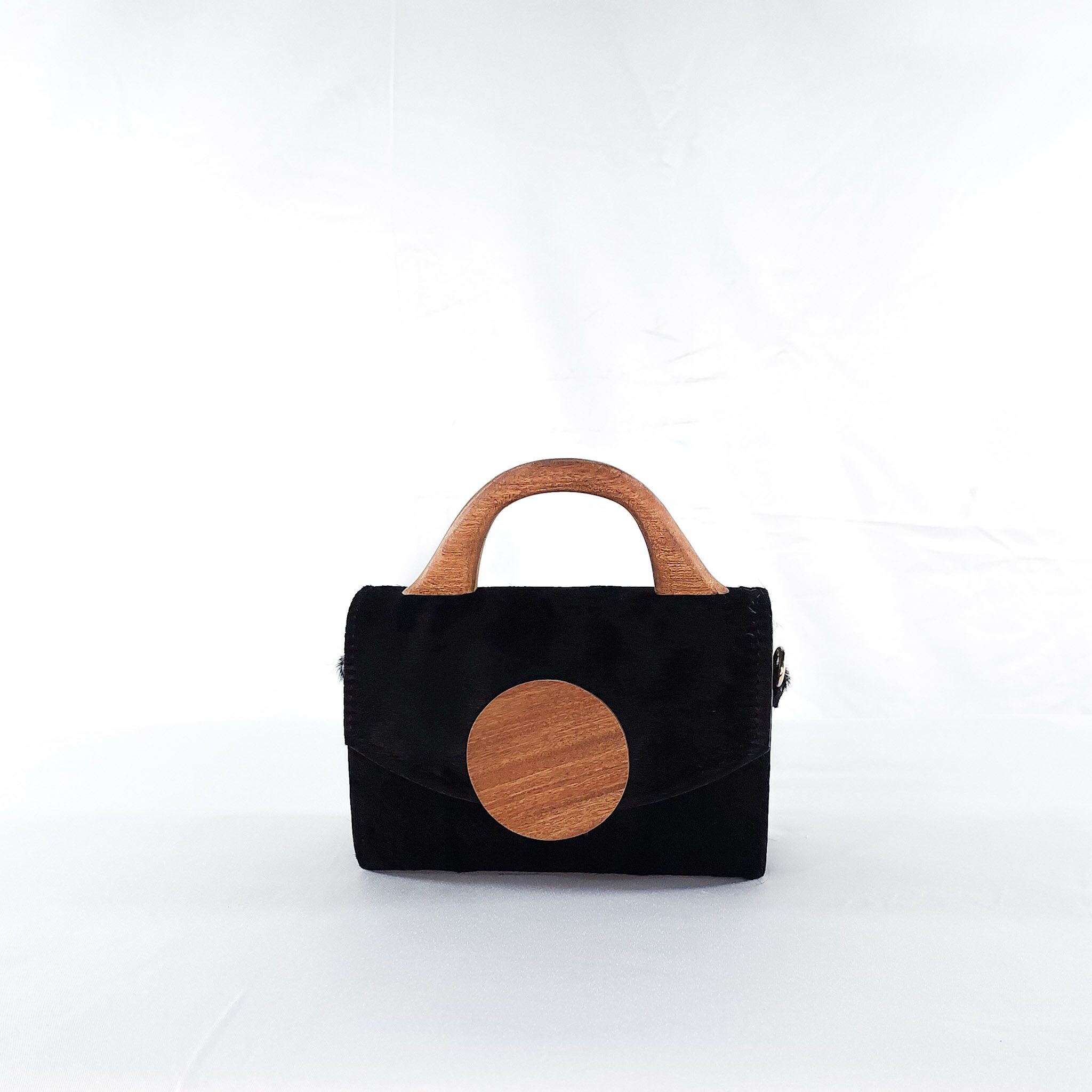 This mini top handle bag from the Coal Soul Collection brings balance to boldness. Designed with clean lines and a compact silhouette, it features a rich black body paired with sculptural wooden accents ? a smooth circular wooden flap accent and a curved, hand-carved handle that feels both grounded and elevated.