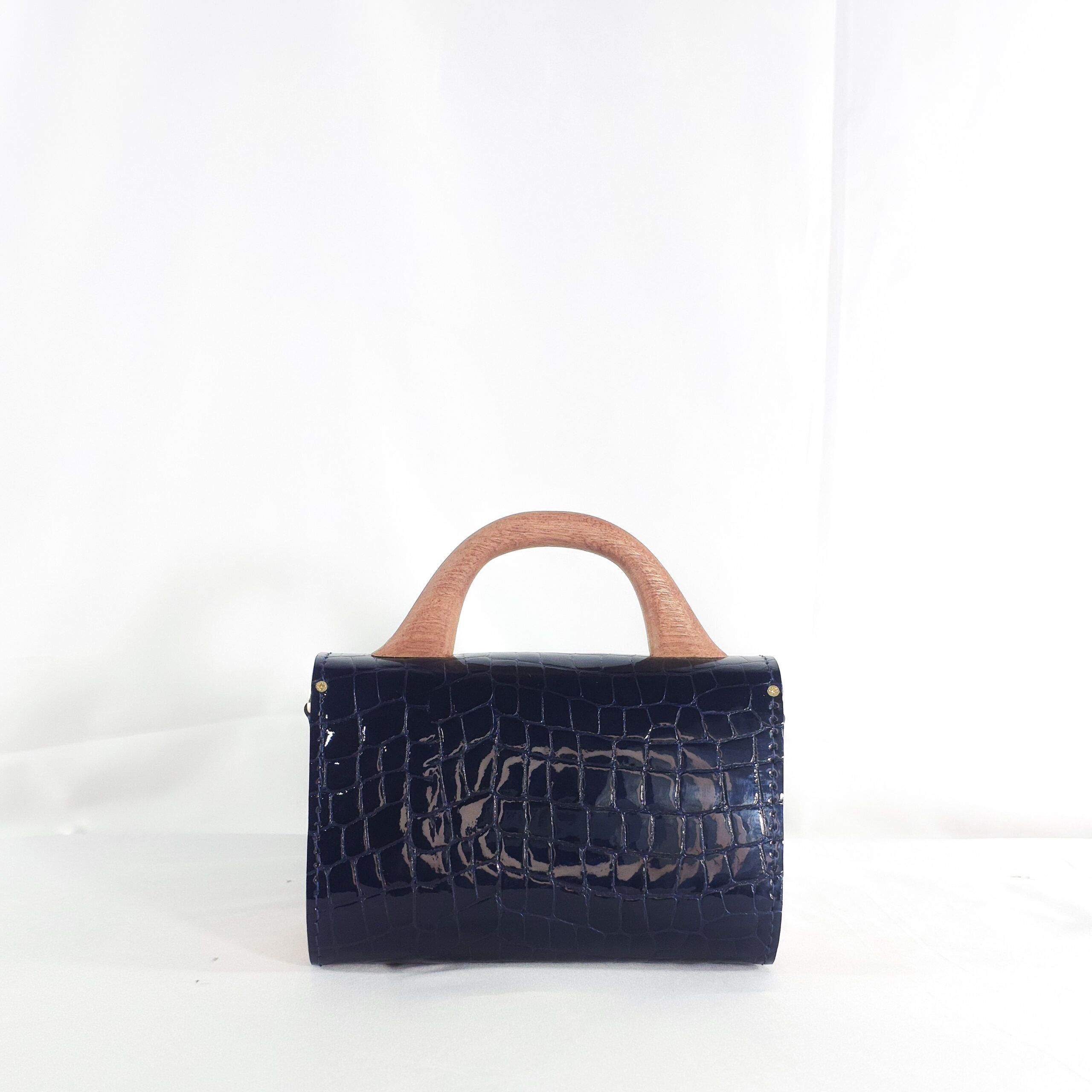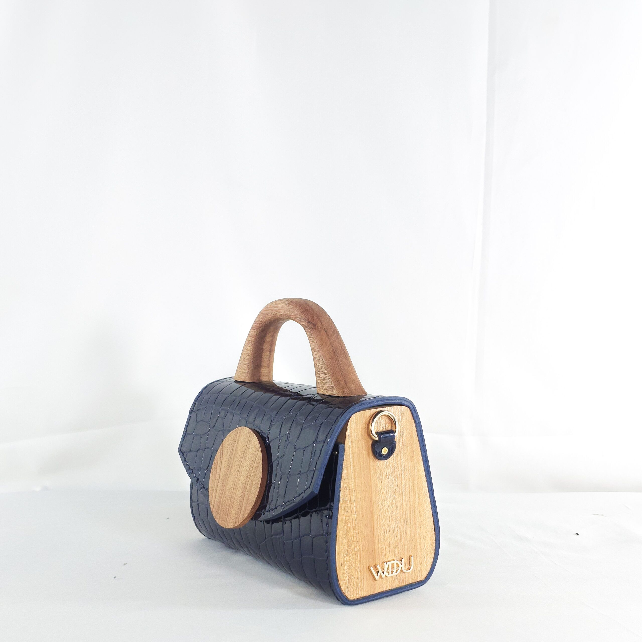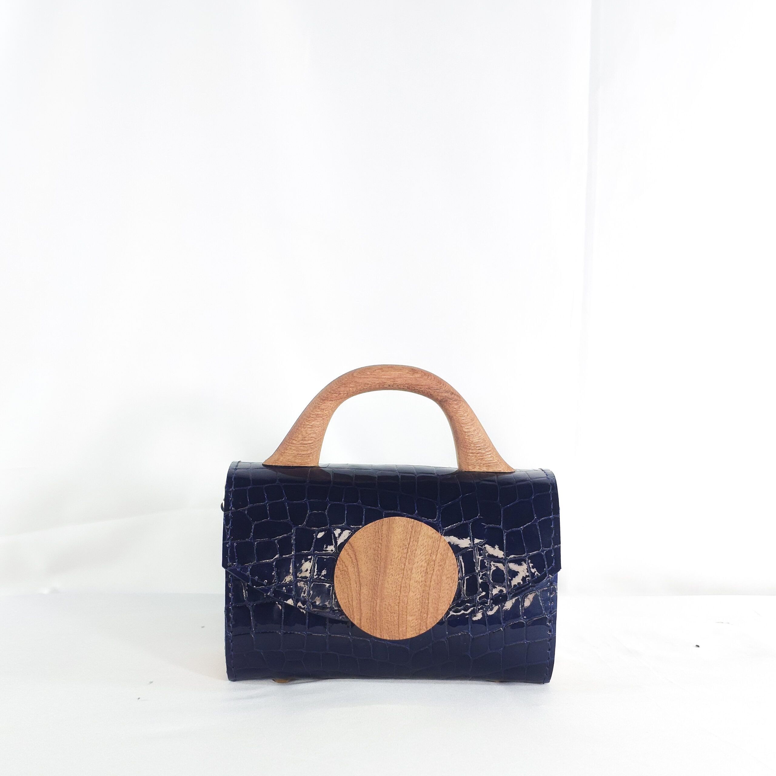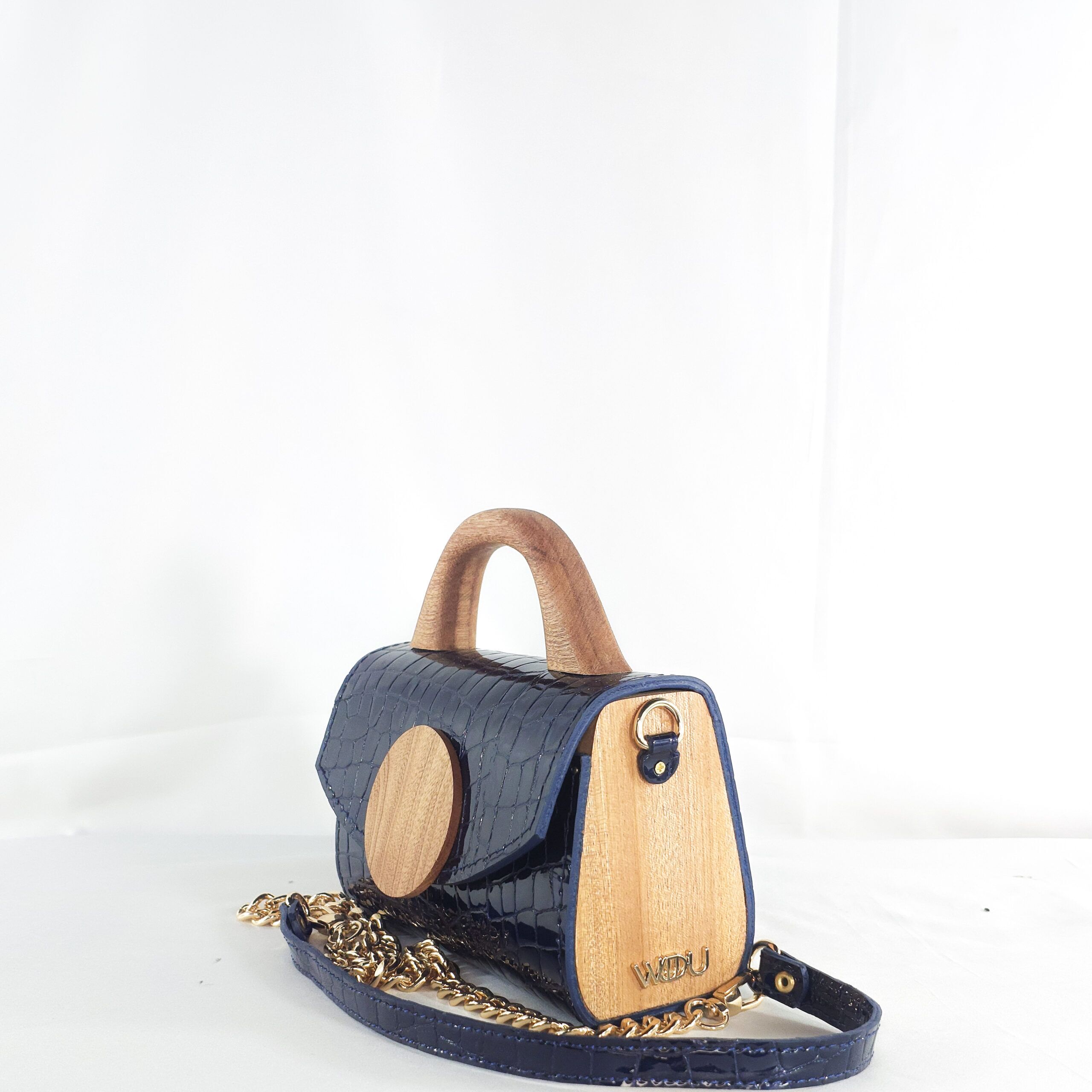 Structure and soul come together in this WUD-U mini top handle bag. This piece exudes bold elegance, crafted from rich ink-blue croc leather that has a glossy, nearly mirror-like finish. A hand-carved wooden top handle adds warmth and a grounded feel, while the smooth circular wood accent on the flap stands as a striking centerpiece and a design signature that celebrates natural textures. Because it is compact and elegant, fusing the best aspects of contemporary craftsmanship with earthy sophistication, this bag is the perfect companion for stylish minimalists and ethical design enthusiasts.