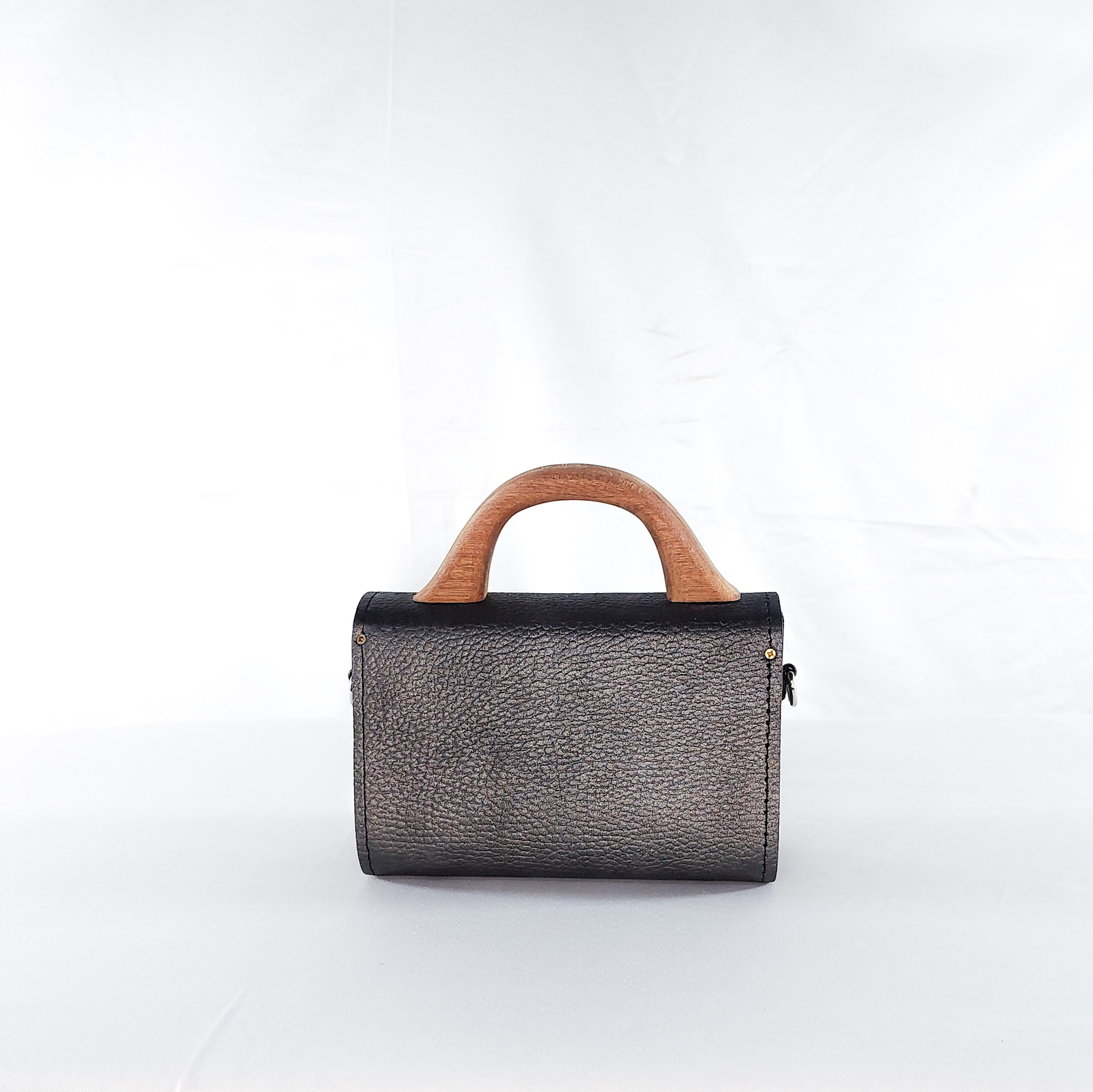This mini top handle bag from the Coal Soul Collection brings balance to boldness. Designed with clean lines and a compact silhouette, it features a rich black body paired with sculptural wooden accents ? a smooth circular wooden flap accent and a curved, hand-carved handle that feels both grounded and elevated.