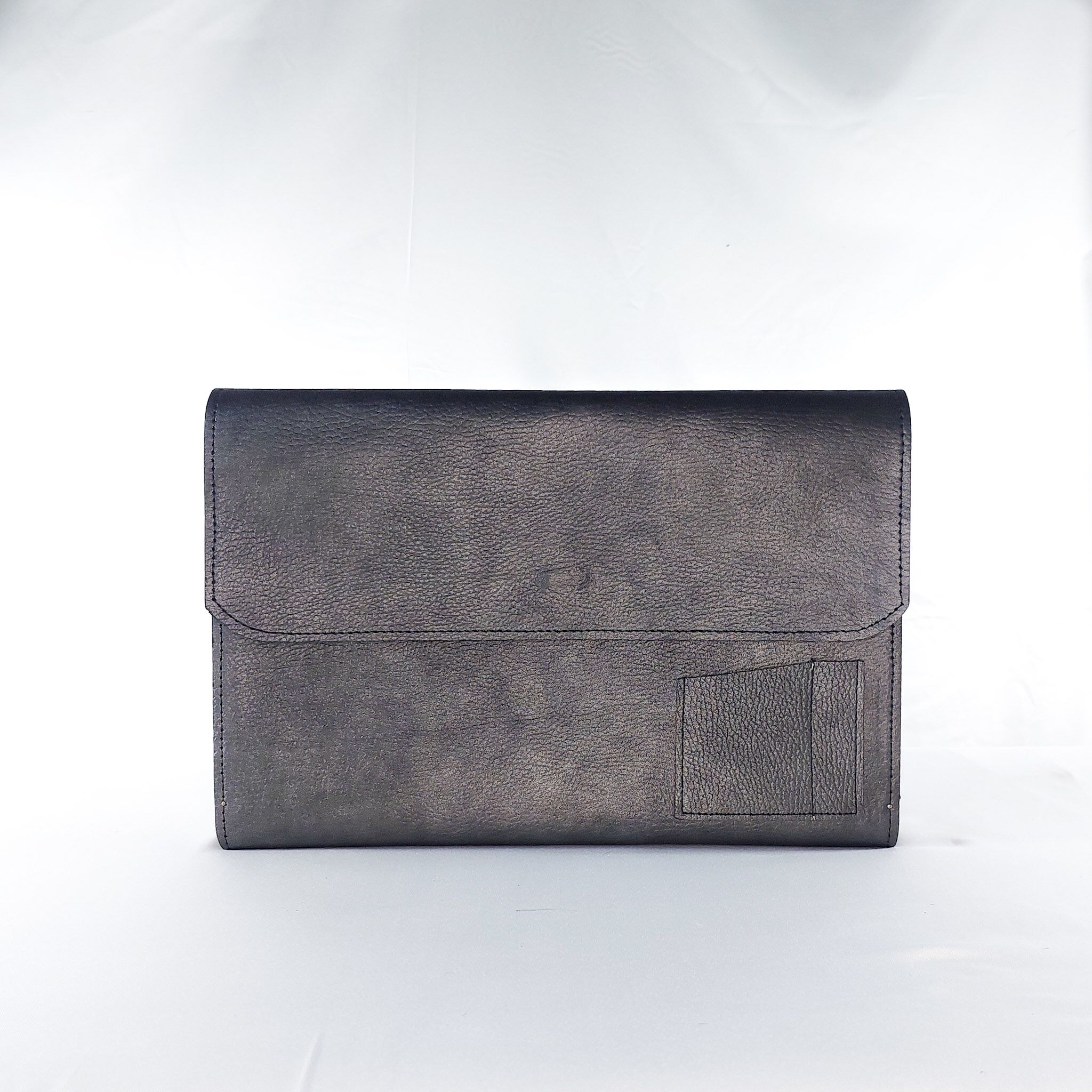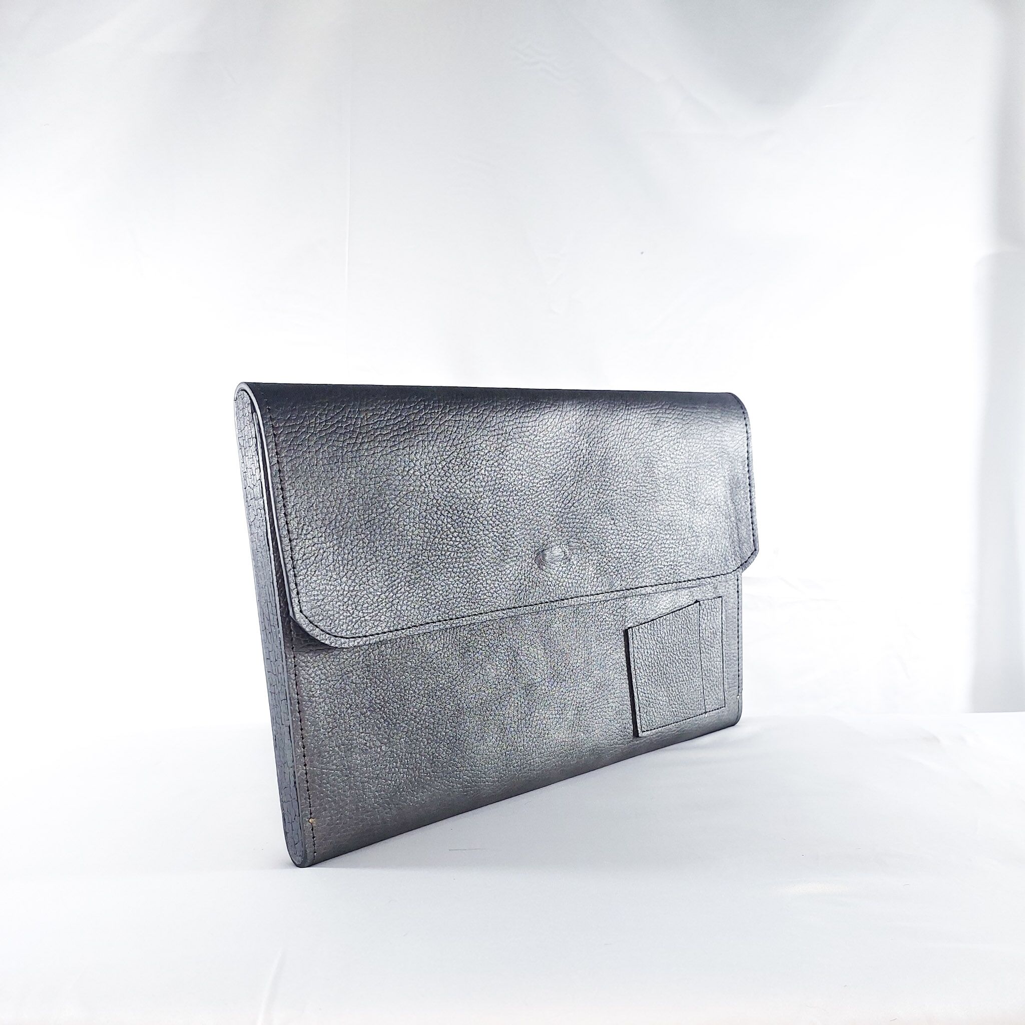 This slim black leather sleeve is a study in quiet sophistication. Designed for professionals who value clarity and intention, it features a smooth fold-over flap, structured form, and subtle edge stitching that keeps the focus on clean craftsmanship. The front includes a discreet patch detail ? ideal for business cards, name tags, or personalization.