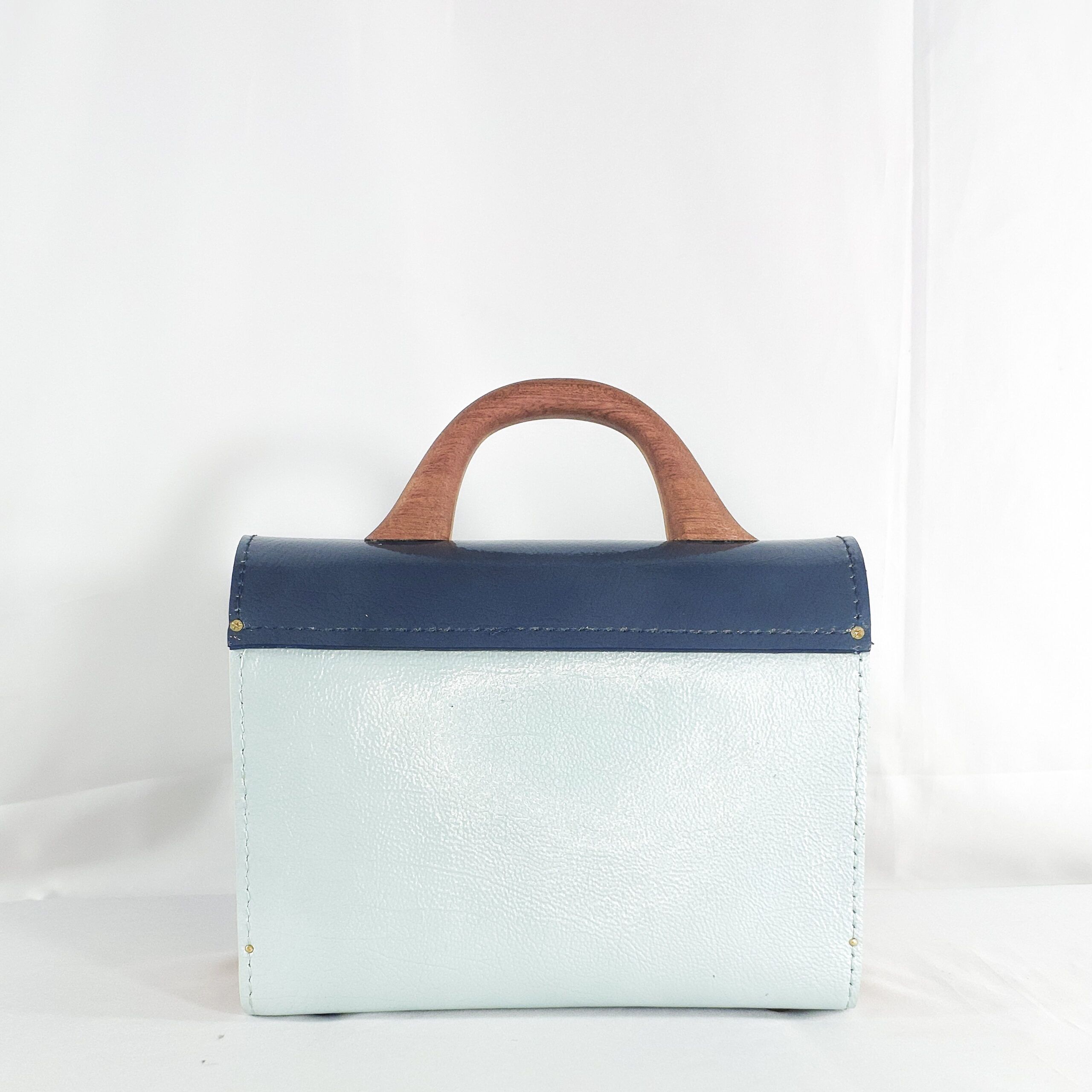 Artfully blending contrast and craftsmanship, this WUD-U top handle bag brings a refined yet expressive edge to everyday style. The upper flap is finished in a glossy deep ocean blue, while the lower half features a gentle sky blue tone in matte texture?creating a harmonious dual-tone effect. A gently curved wooden handle adds organic warmth and balance, while the circular wooden accent on the flap?smoothly carved and uniquely grained?serves as the bag?s natural centerpiece. Designed for those who appreciate both boldness and balance, this bag is handcrafted with sustainable intent and creative spirit. Whether carried at brunch or in the boardroom, it speaks of taste, tradition, and thoughtful design.