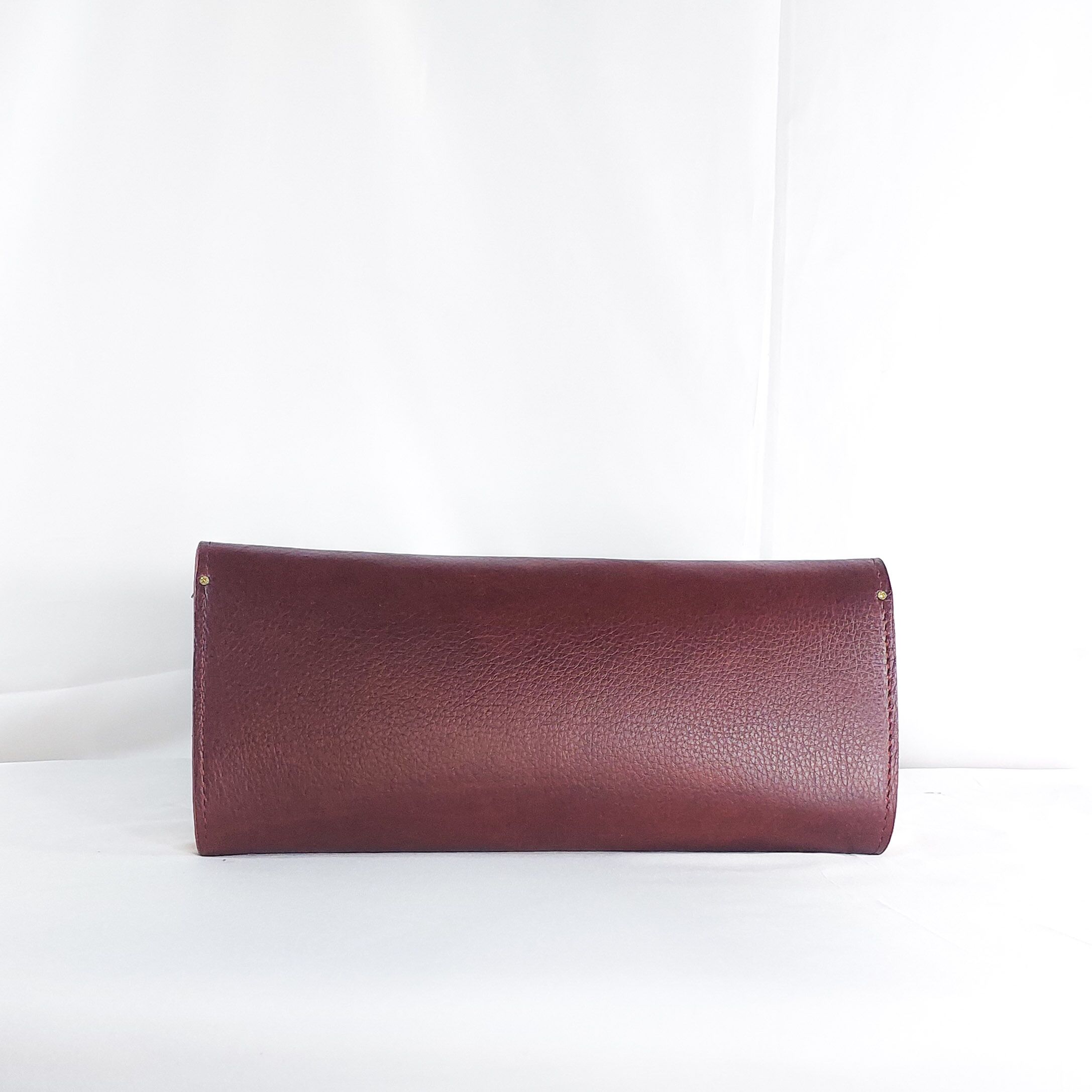 This Dzifa Maxi Clutch in burgundy is a bold embodiment of WUD-U?s eco-luxe design philosophy. Crafted from richly textured leather in a deep wine tone, this sleek clutch features a striking diagonal wooden flap accent that adds warmth, texture, and architectural charm. Its structured silhouette holds evening essentials with ease, while the minimalist design lets the materials speak. Whether tucked under your arm at a gallery opening or paired with structured daywear, this piece radiates understated elegance with an unmistakable touch of nature?s raw beauty?made for the discerning soul who dares to be different.
