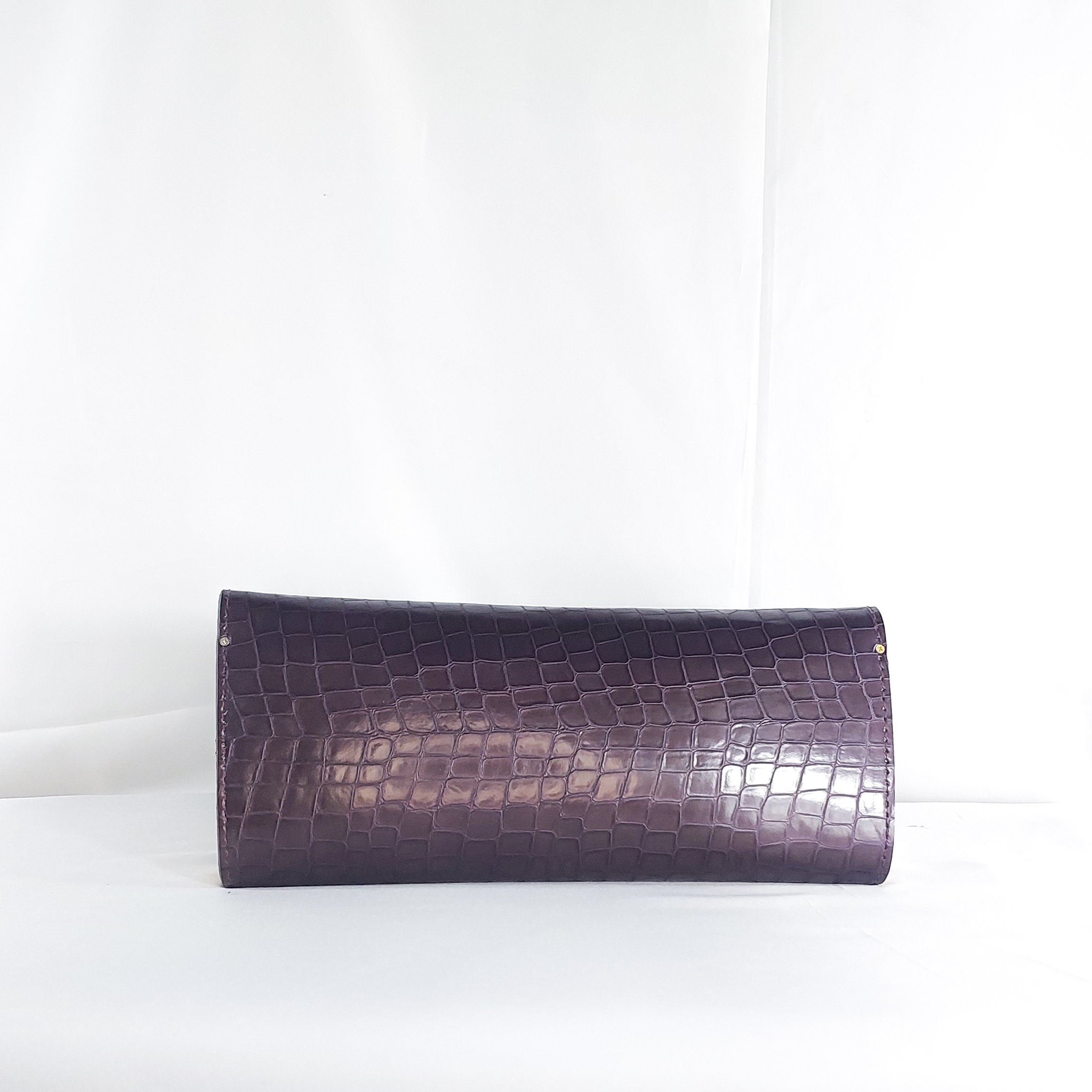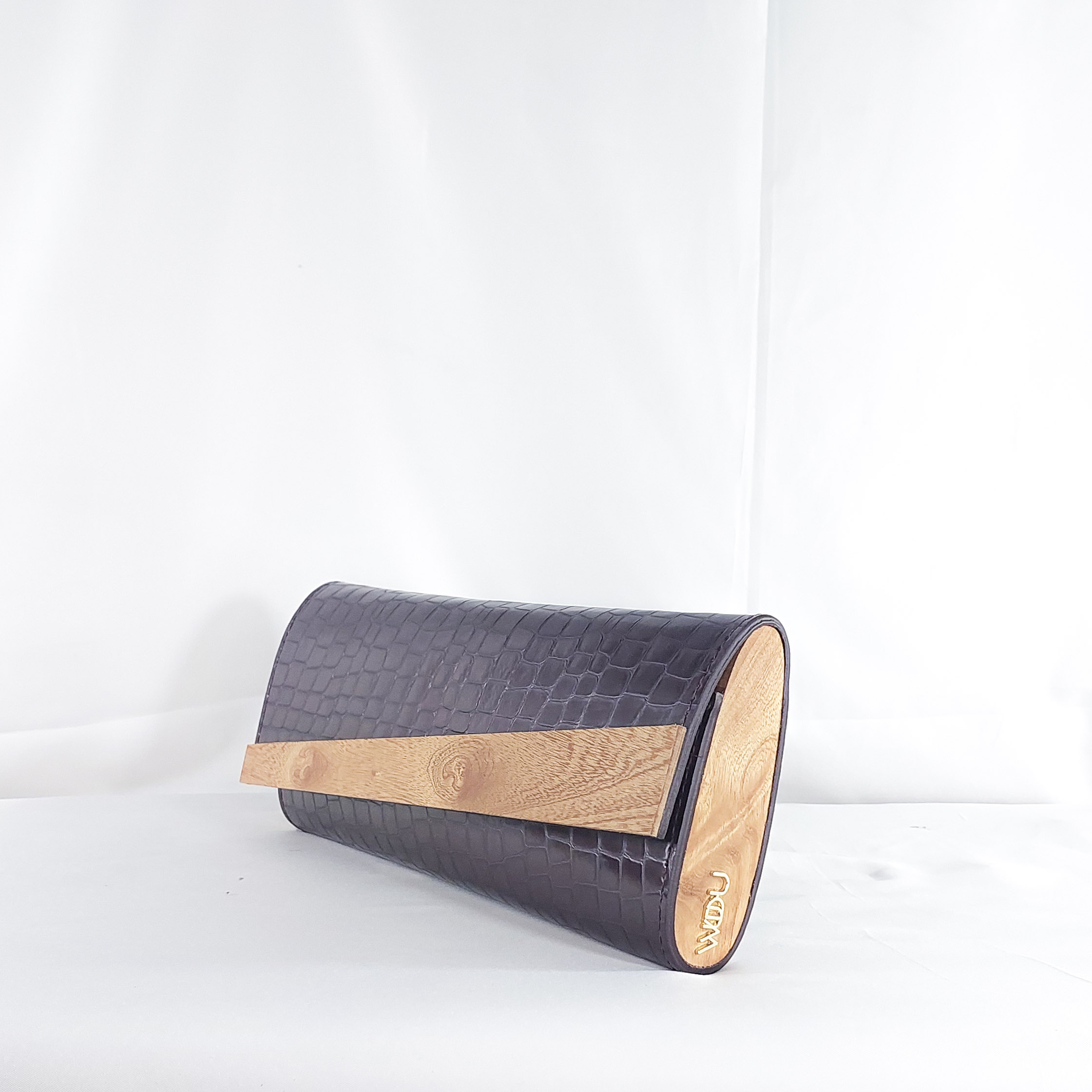 Bold, elegant, and unapologetically refined, this Dzifa Maxi Clutch in rich plum croc-textured leather brings high drama to artisanal fashion. The deep, glossy finish of the croc-embossed exterior exudes evening-ready luxury, while the clutch?s elongated, sculpted silhouette maintains a minimalist form. A smooth diagonal hardwood strip runs across the flap, its raw grain offering grounding contrast against the luxe surface. The wooden flap accent is not a clasp but a deliberate design statement, embodying WUD.U?s blend of nature and form. Perfect for formal occasions, gallery nights, or when you simply want to command attention with quiet strength, this piece is sustainably handcrafted and fiercely distinct.