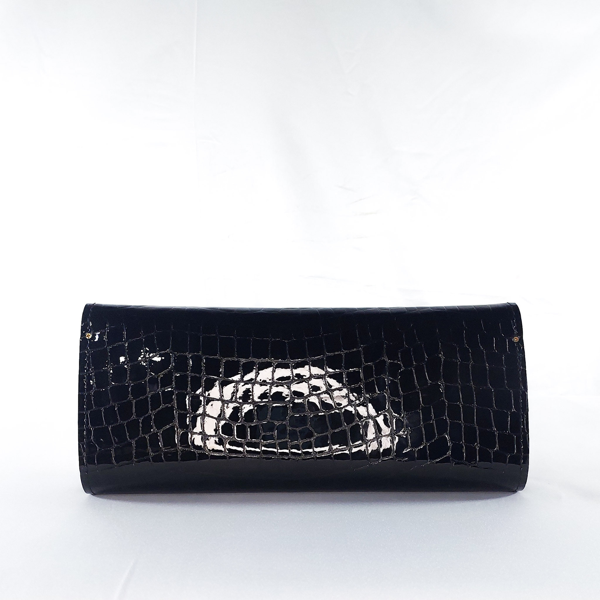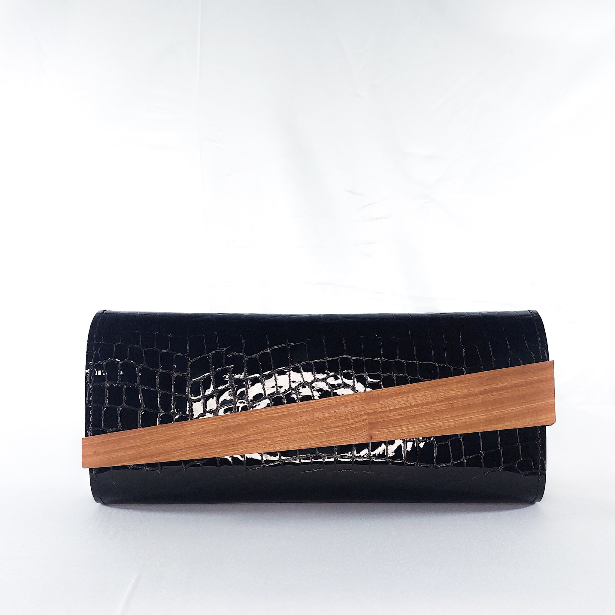 Crafted from black croc-embossed leather, this cylindrical clutch brings an edge of wild refinement to your accessory game. A clean, polished wooden strip runs diagonally across the body, merging nature?s warmth with contemporary design. The texture of the leather contrasts beautifully with the smooth grain of the wood, creating a piece that is bold, structured, and unapologetically luxe. Perfect for events where a daring accessory seals the look.