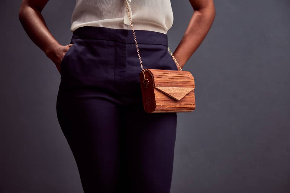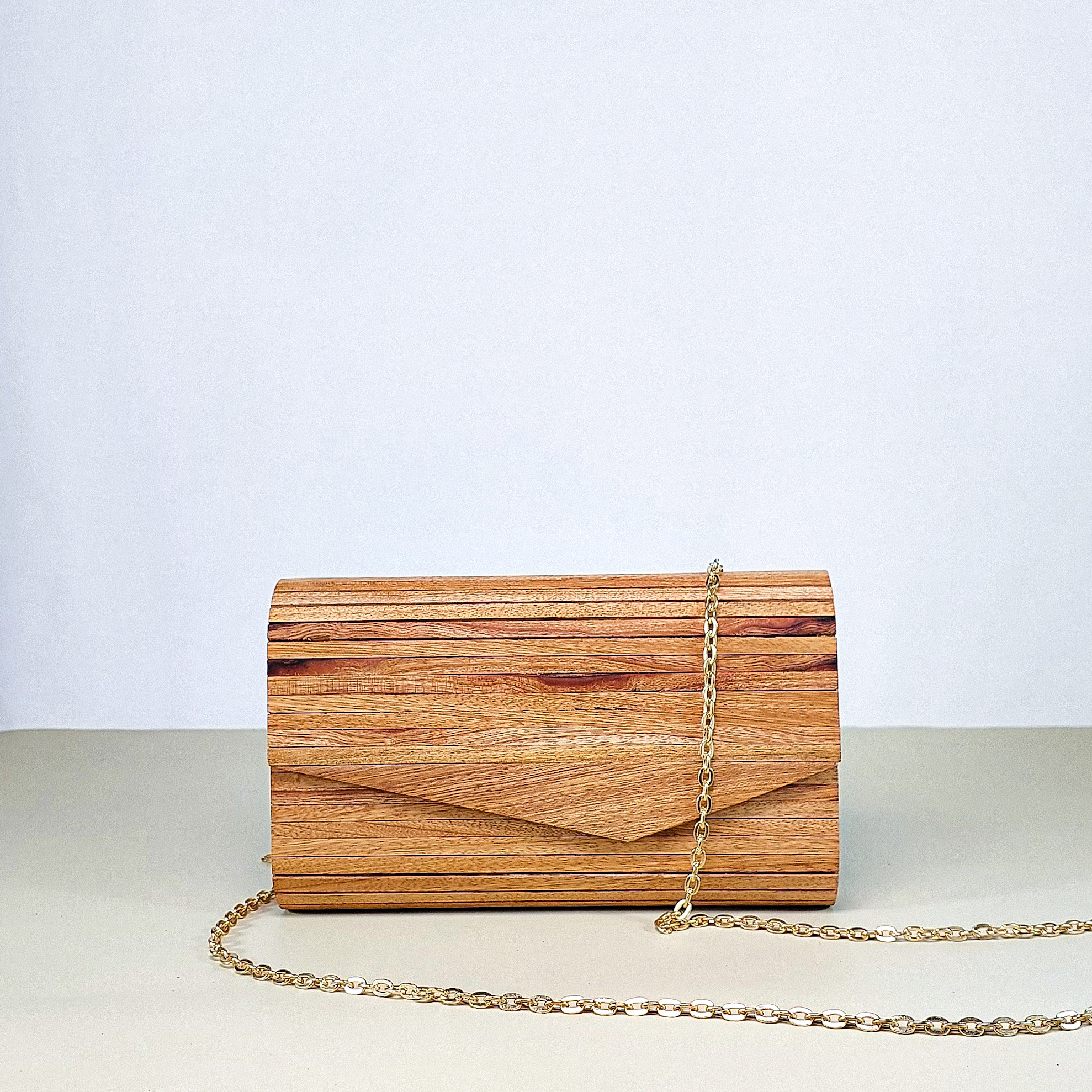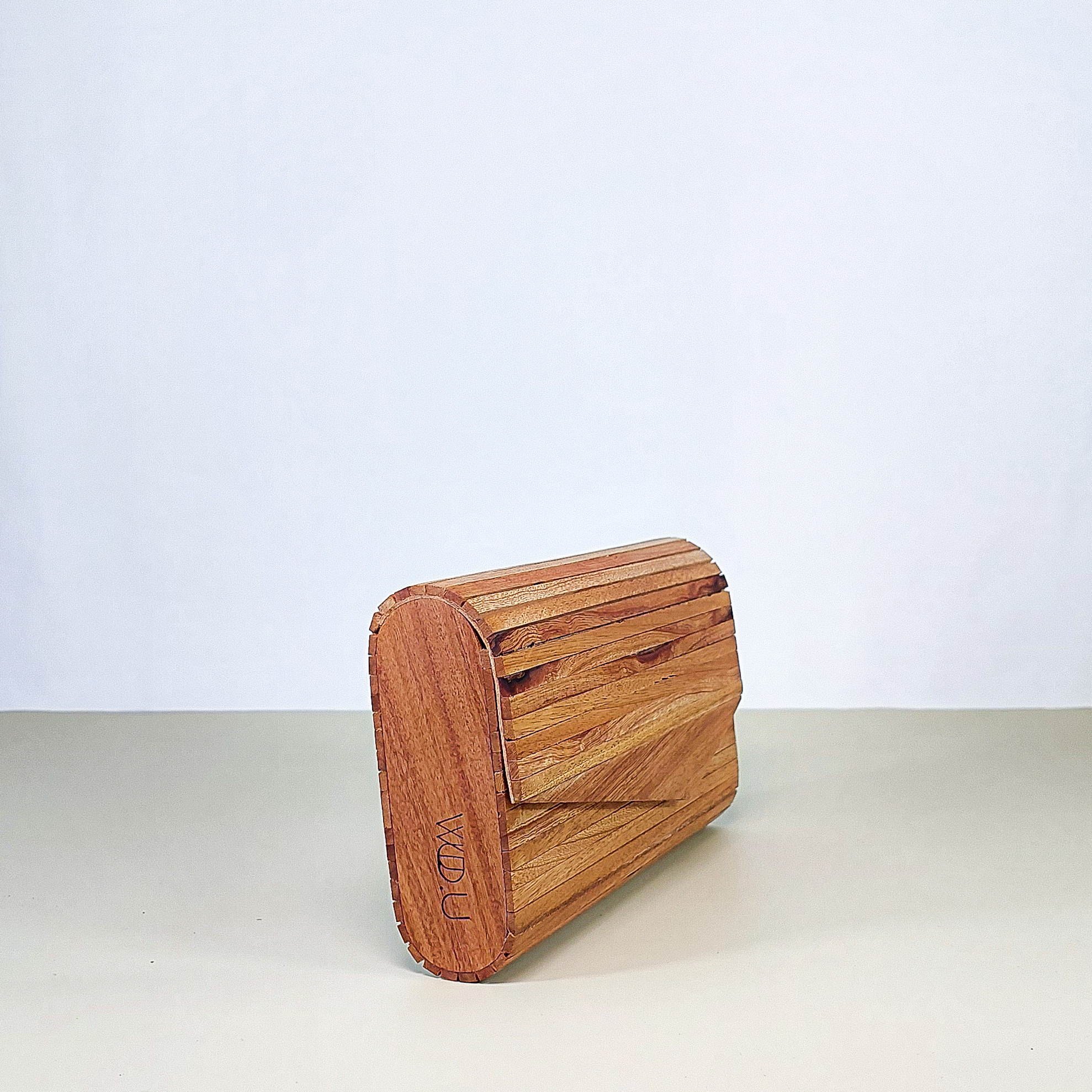 This wooden clutch is a statement in form, texture, and craftsmanship. Entirely handcrafted from narrow, layered strips of wood, its surface tells a natural story ? each grain line unique, each detail intentional. The sculpted front flap blends seamlessly into the design, creating a clean, geometric finish.
