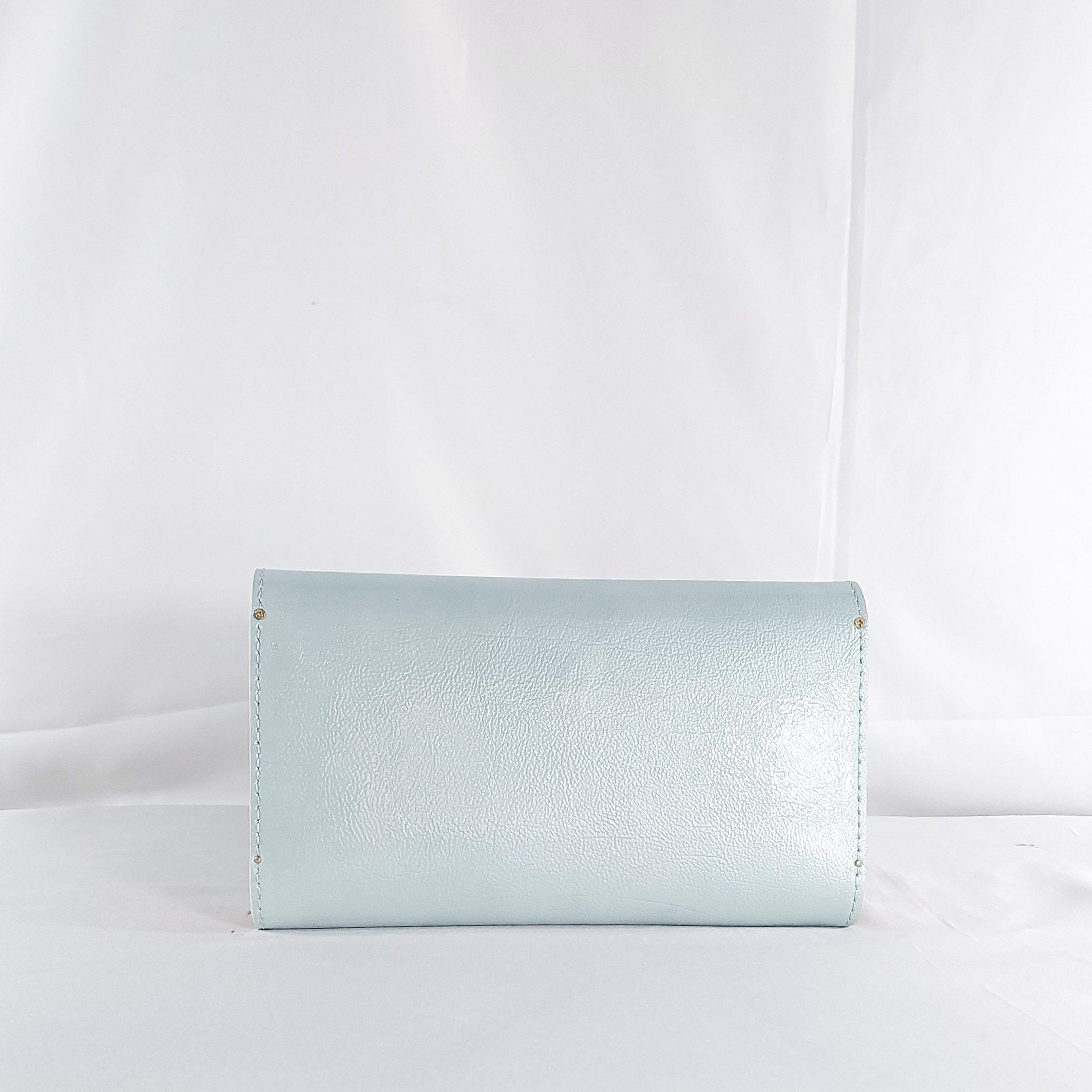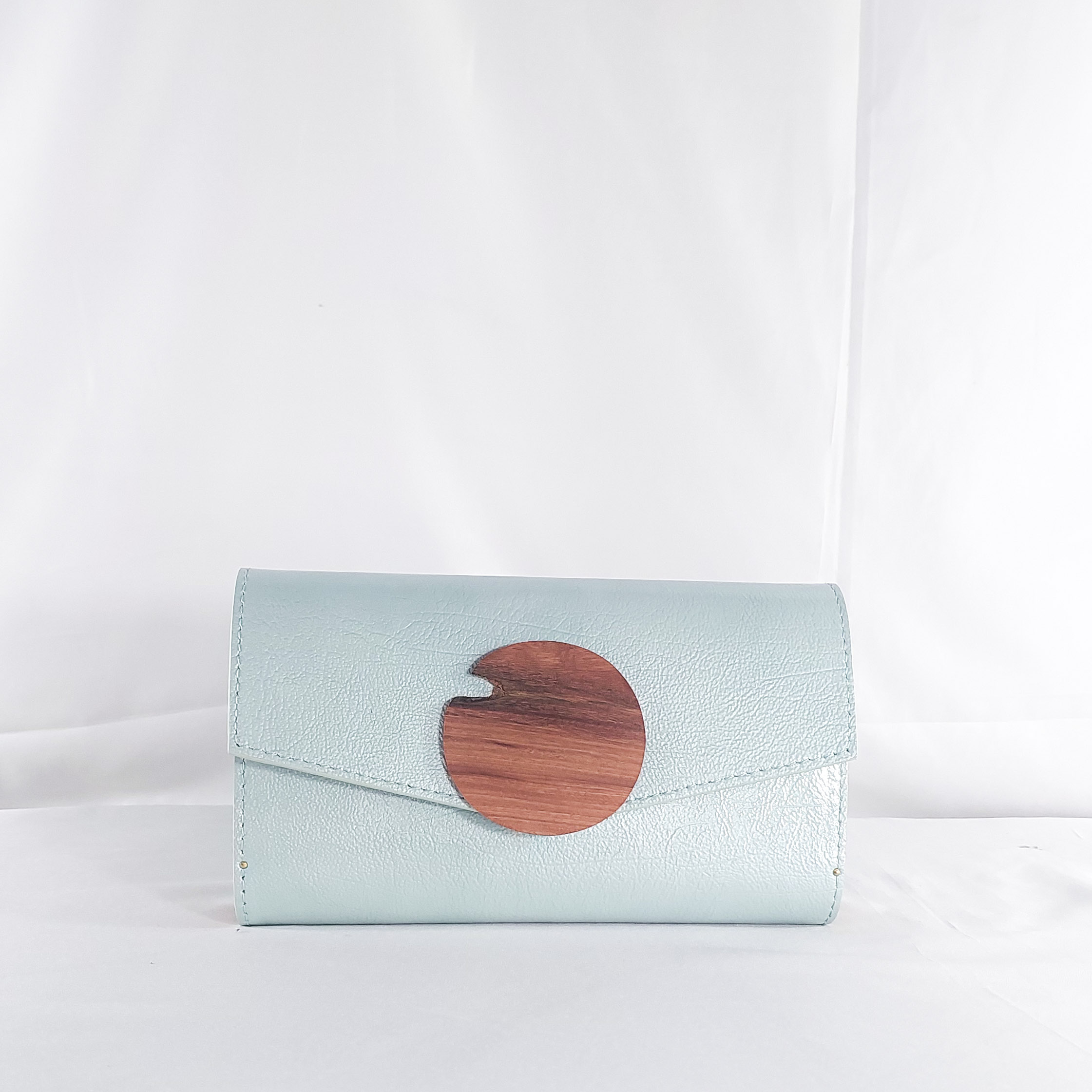The Nana Ama Medium Clutch in serene ice blue is a perfect blend of calm elegance and artisanal boldness. Its clean, minimalist silhouette is complemented by a rich wooden flap accent carved in a perfectly imperfect circle?adding both organic warmth and visual intrigue. Whether you’re dressing for a quiet brunch or an elevated evening out, this clutch offers refined style with a soulful, handcrafted touch. It?s not just an accessory?it?s an artistic expression of quiet strength.