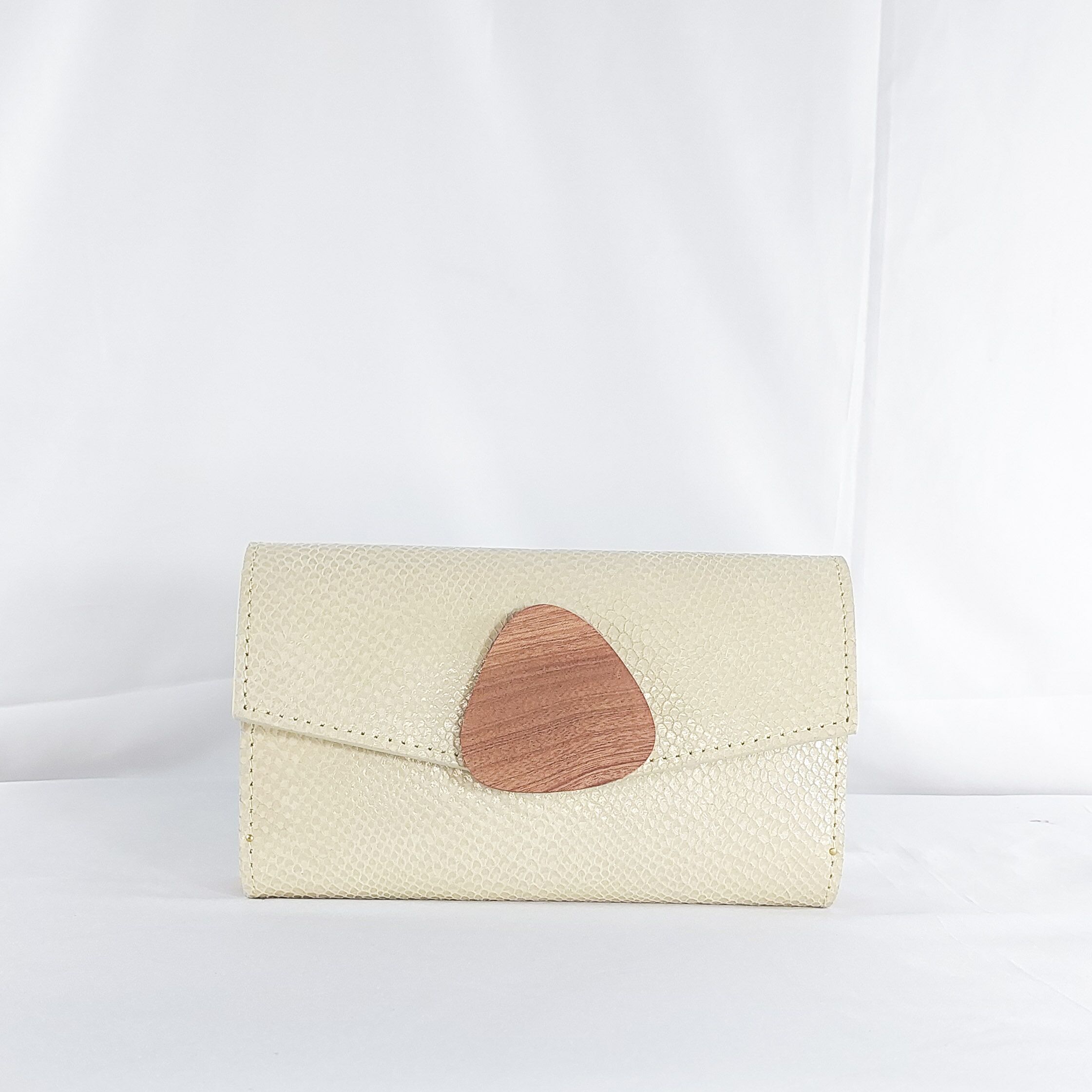 This Nana Ama Medium Clutch is a celebration of cultural depth and understated luxury. Crafted from textured ivory snakeskin, this compact yet striking accessory exudes quiet confidence. A rich, organic, raw, and distinctively grained wooden accent anchors its curved flap, providing a grounded contrast to the elegant surface. Named to honor regal femininity, this clutch transitions seamlessly from day to night, making it the perfect companion for weddings, ceremonies, and refined soir�es. A minimalist design with maximum impact, this Nana Ama clutch is made for the woman who leads with grace and quiet power.