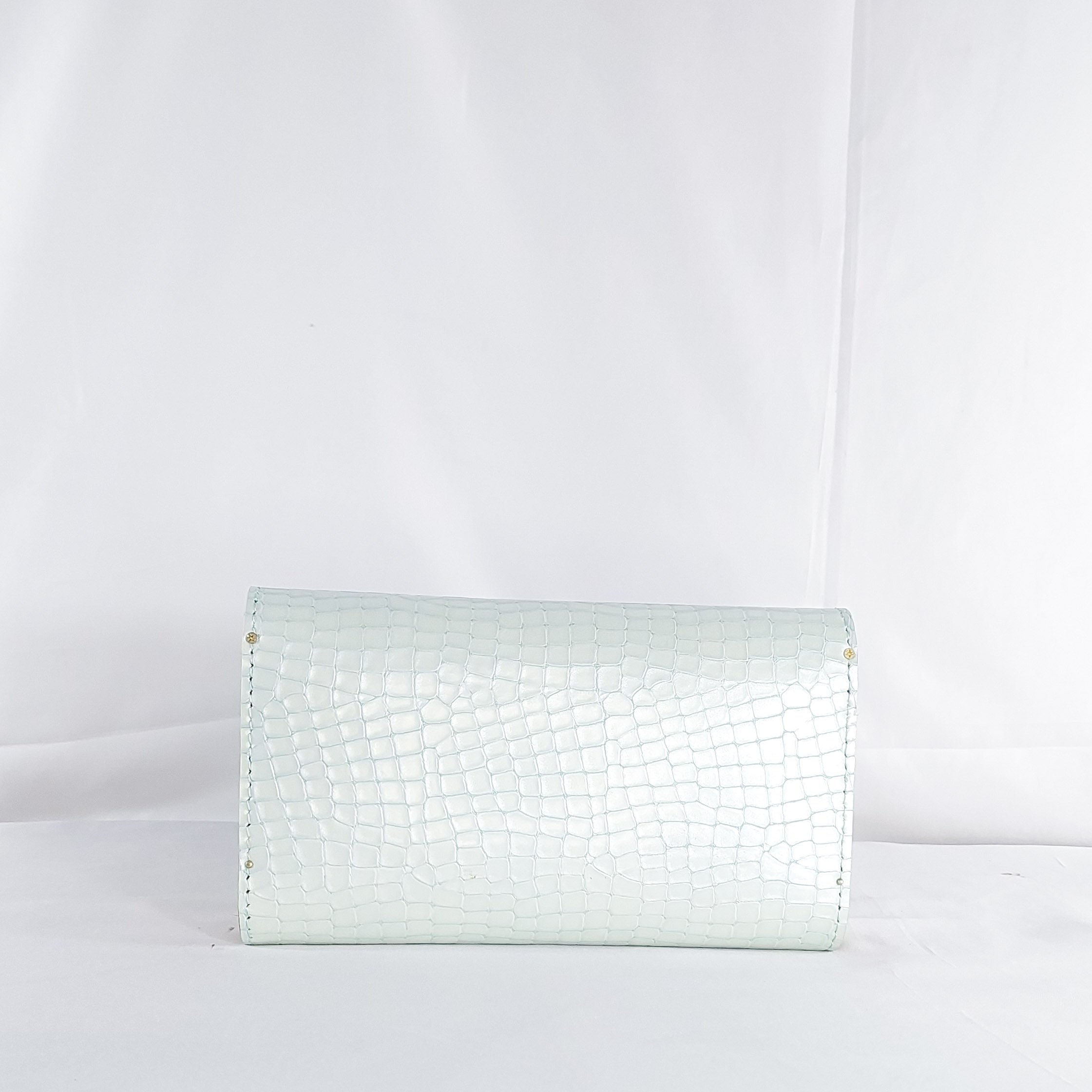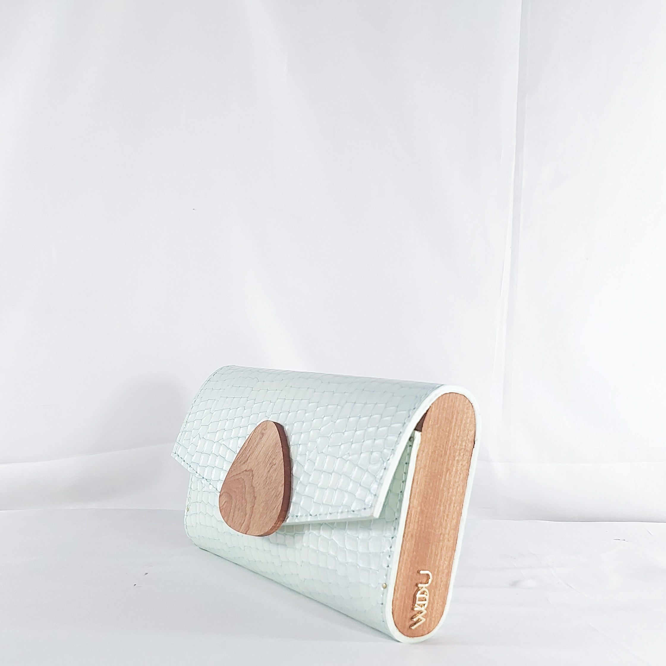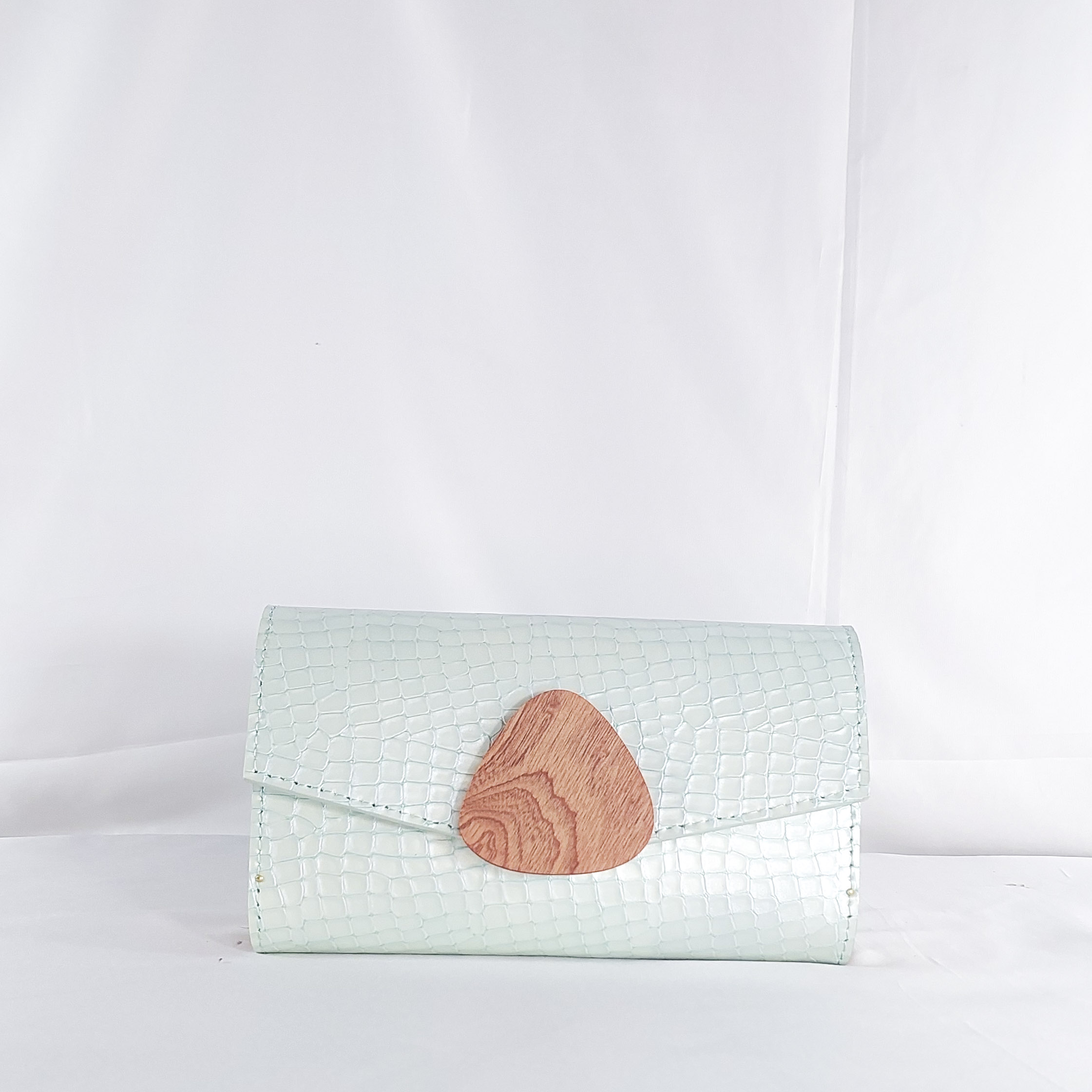 Effortlessly cool and unmistakably refined, this Nana Ama Medium Clutch in mint croc-textured leather is a breath of fresh air. The soft pastel tone exudes calm sophistication, while the structured silhouette brings modern polish. At its heart lies a hand-cut wooden flap accent?a nod to organic beauty and artisanal craftsmanship. Whether you’re stepping into daylight events or bringing a fresh twist to evening wear, this clutch is a graceful fusion of elegance, edge, and eco-conscious design.