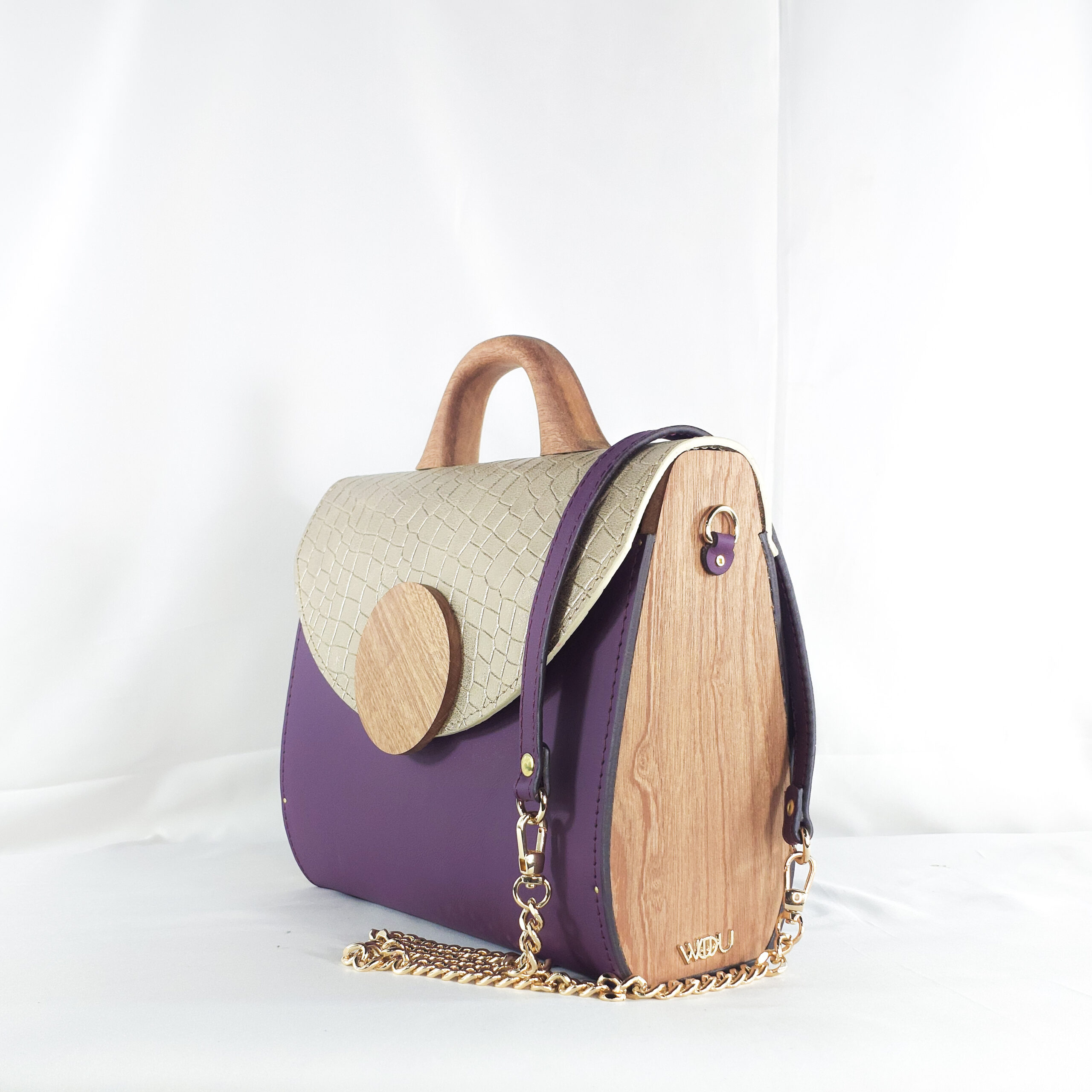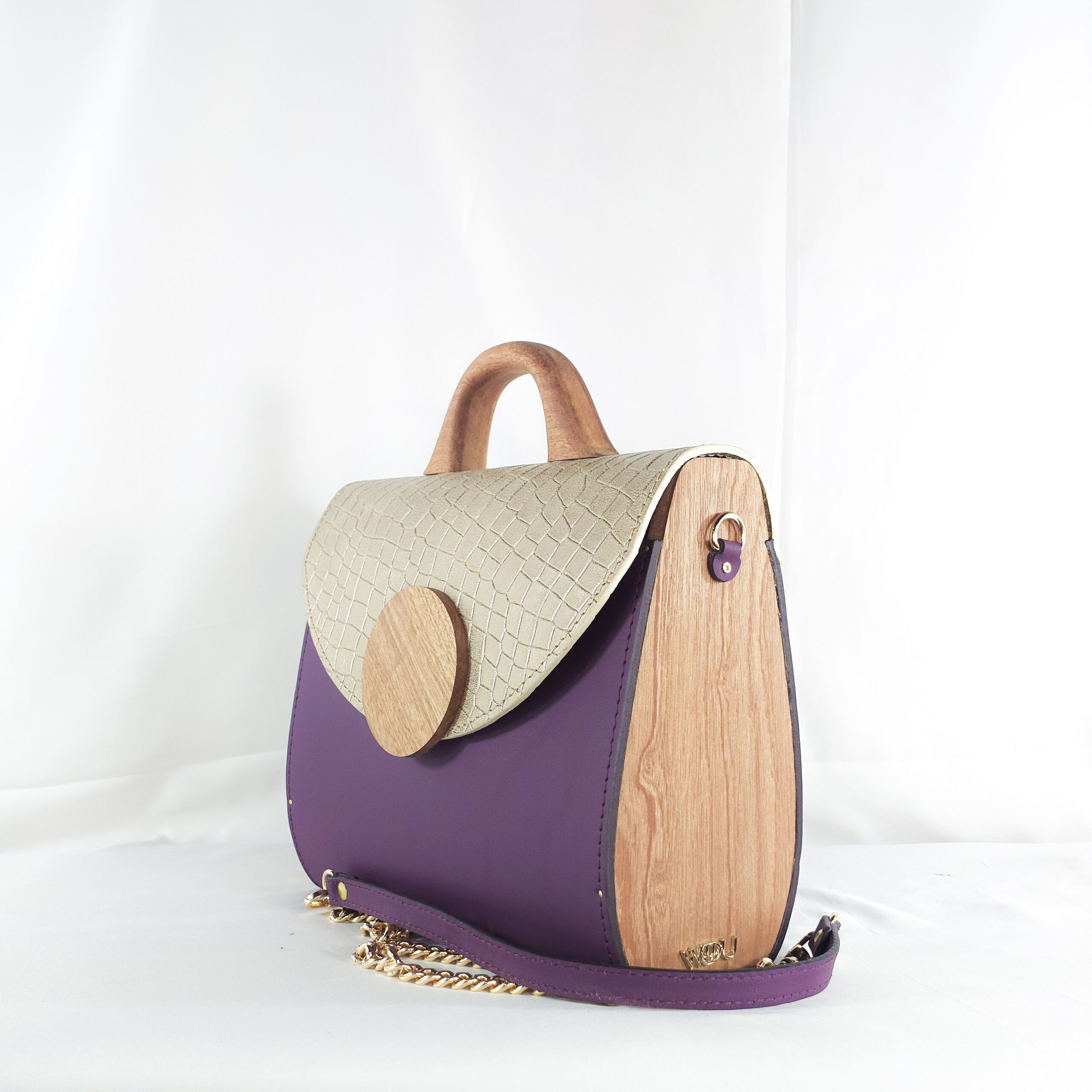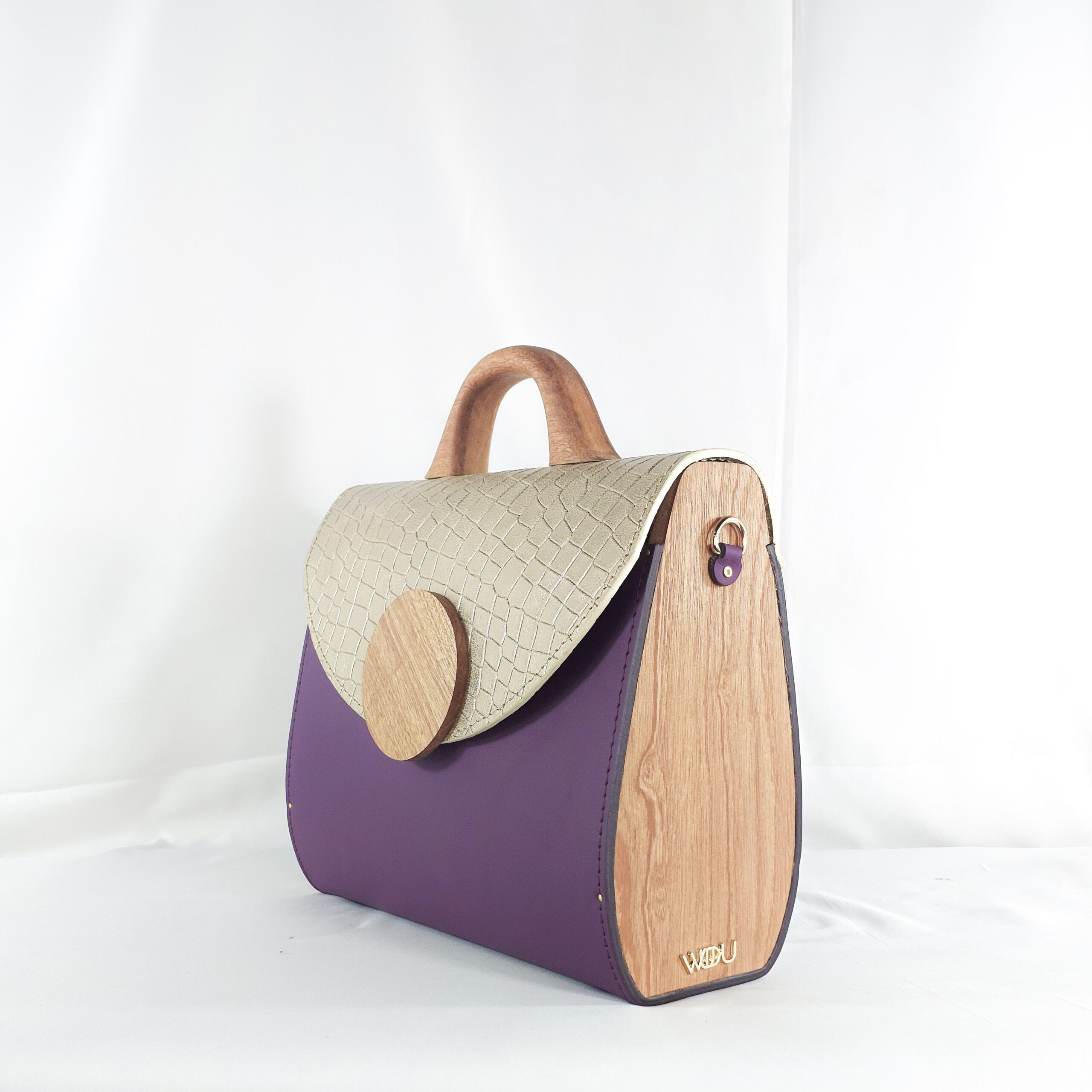 Introducing a one-of-a-kind WUD-U creation that effortlessly blends luxury, sustainability, and artistry. This structured handbag exudes modern elegance with its eye-catching combination of deep purple leather and a shimmering gold crocodile-textured flap. The flap is secured by a distinct circular wooden flap accent that echoes the natural handle?each crafted from locally sourced redwood. This fusion of contemporary design and indigenous craftsmanship makes the bag not only functional but also a wearable piece of art. Perfect for day-to-night transitions, it’s a bold expression of individuality and a celebration of eco-conscious fashion. Ideal for the style-forward woman who dares to be different.