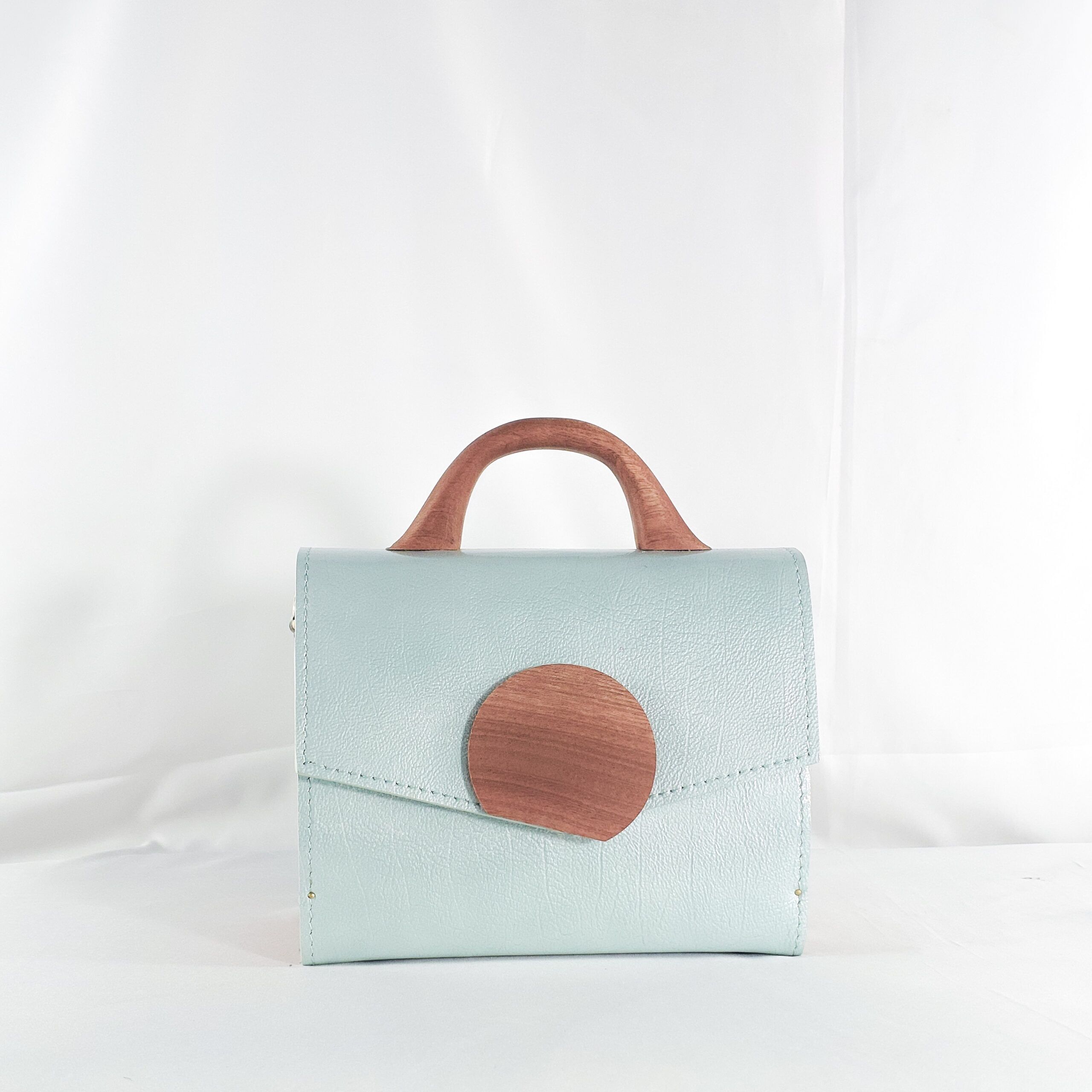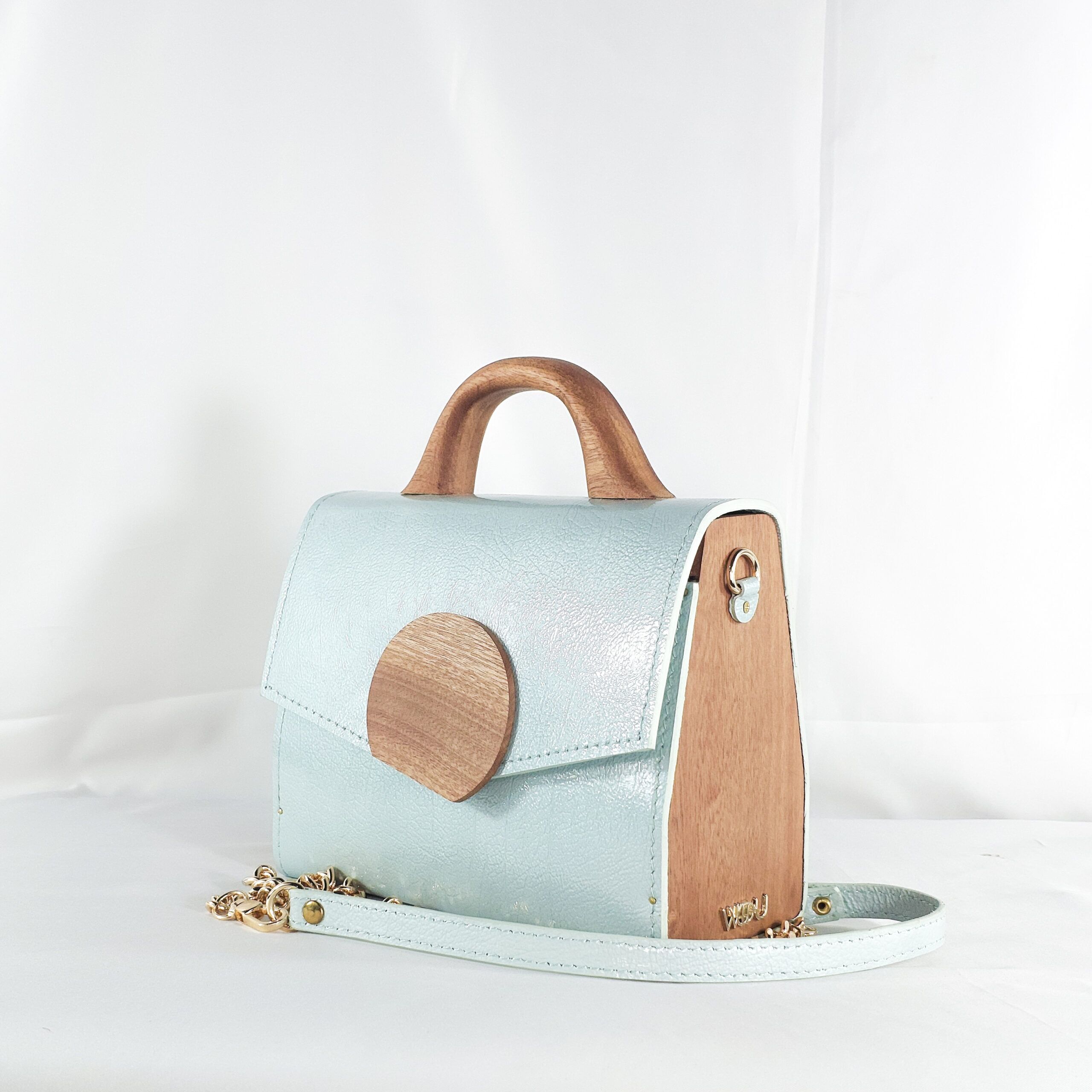 Delicately balanced between modern minimalism and earthy charm, this WUD.U top handle bag is a breath of fresh style. Wrapped in icy blue leather with a subtle texture, it offers a serene, airy presence. The gracefully curved wooden handle brings in organic contrast, while the circular wooden flap accent?polished to reveal rich natural grain?acts as a signature design element, not a clasp. Understated yet expressive, this piece complements both muted and bold outfits with quiet elegance. Sustainably handcrafted and designed to inspire, it’s a timeless accessory for those who lead with grace and grounded confidence.