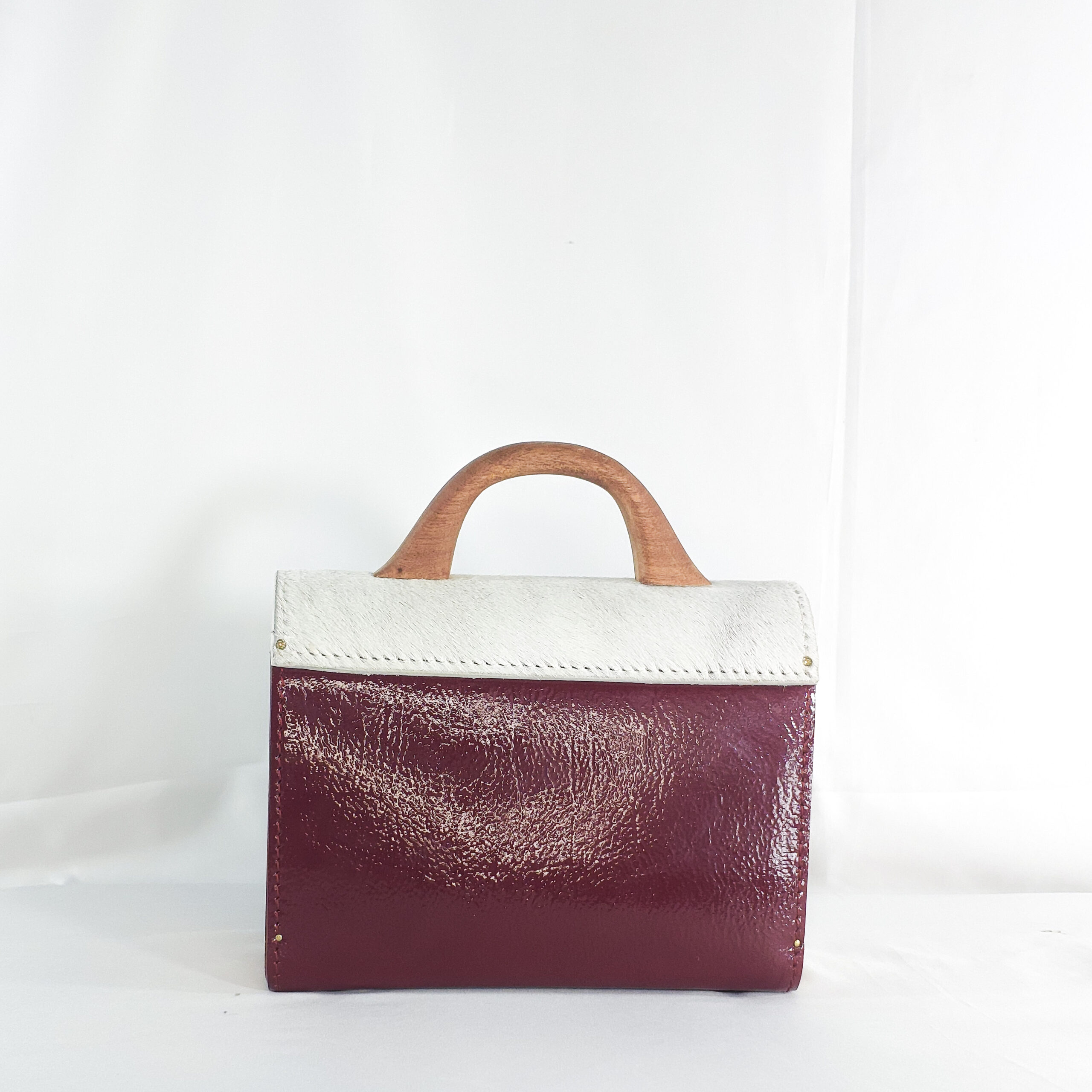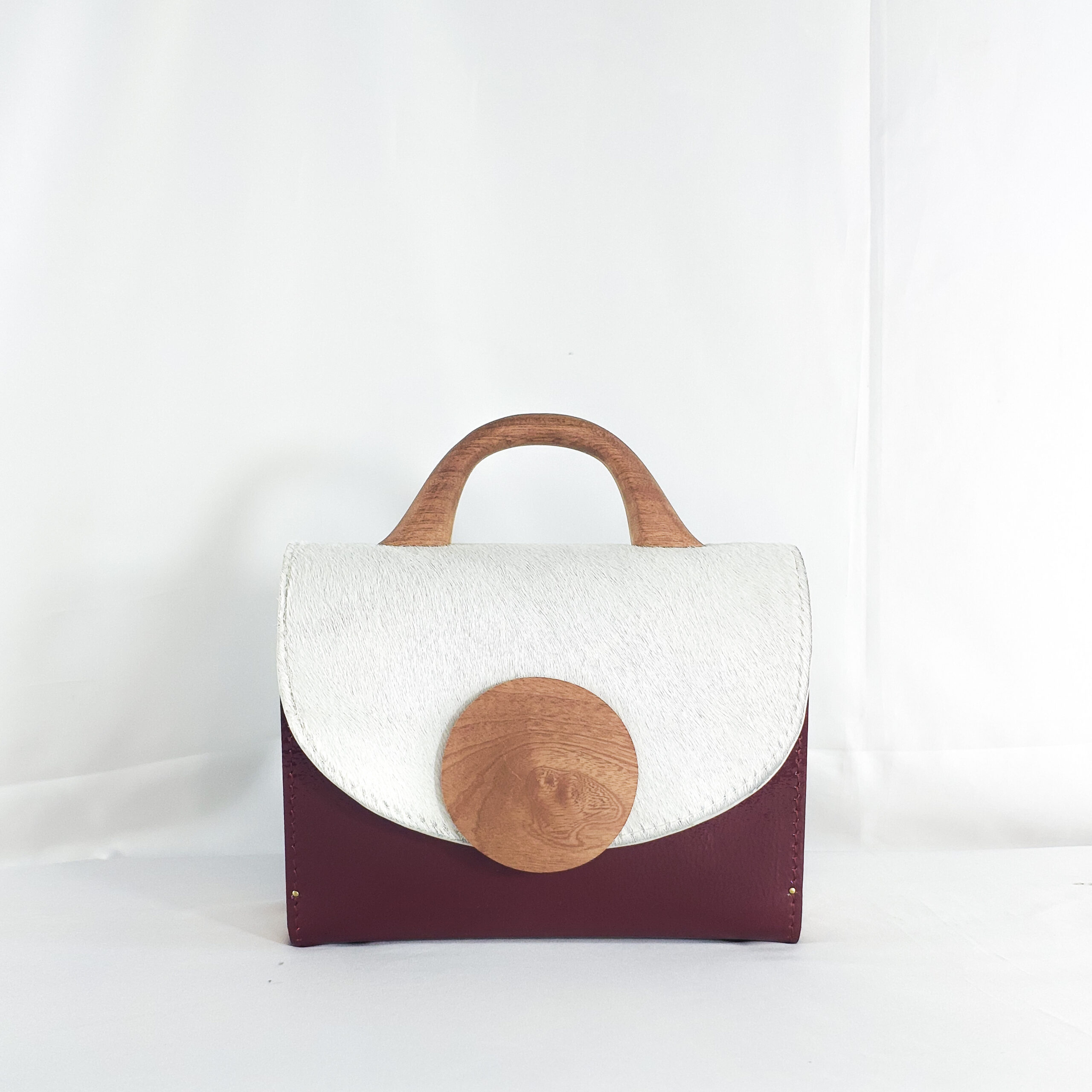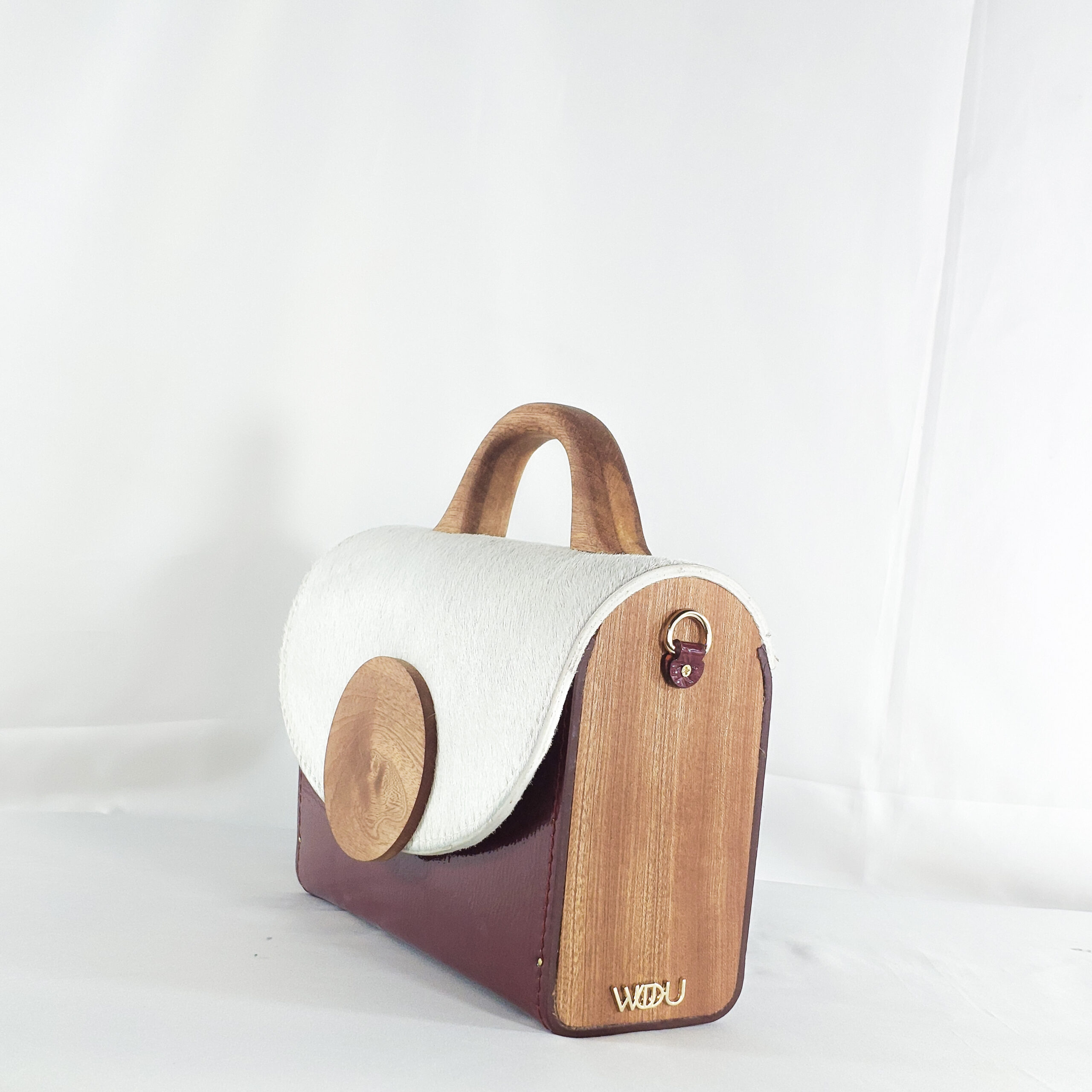 Elevated minimalism meets organic artistry in this WUD. U top handle bag. The design is thoughtfully layered with a tactile white hair-on-texture flap and a rich burgundy leather base, creating a contrast that’s both clean and captivating. A hand-carved wooden handle adds a natural sculptural element, while the bold circular wooden flap accent?smooth and richly grained?serves as the visual anchor. Not a clasp, but a statement of form and authenticity. This piece is perfect for those who embrace soft power and thoughtful style. Sustainably crafted with locally sourced materials, it’s a true reflection of WUD. U’s ethos: artful, ethical, and undeniably unique.